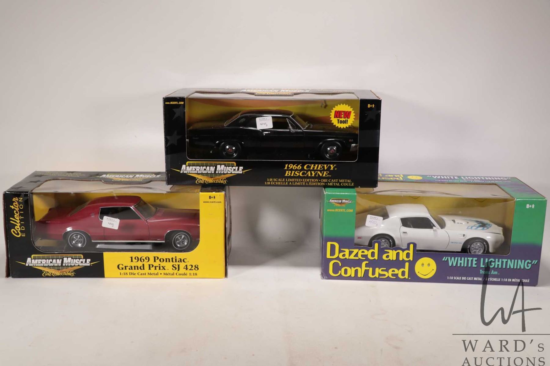 Three 1:18 scale die cast cars including "White Lightening" Trans Am, 1969 Pontiac Grand Prix SJ 428 and a 1966 Chevy Biscayne