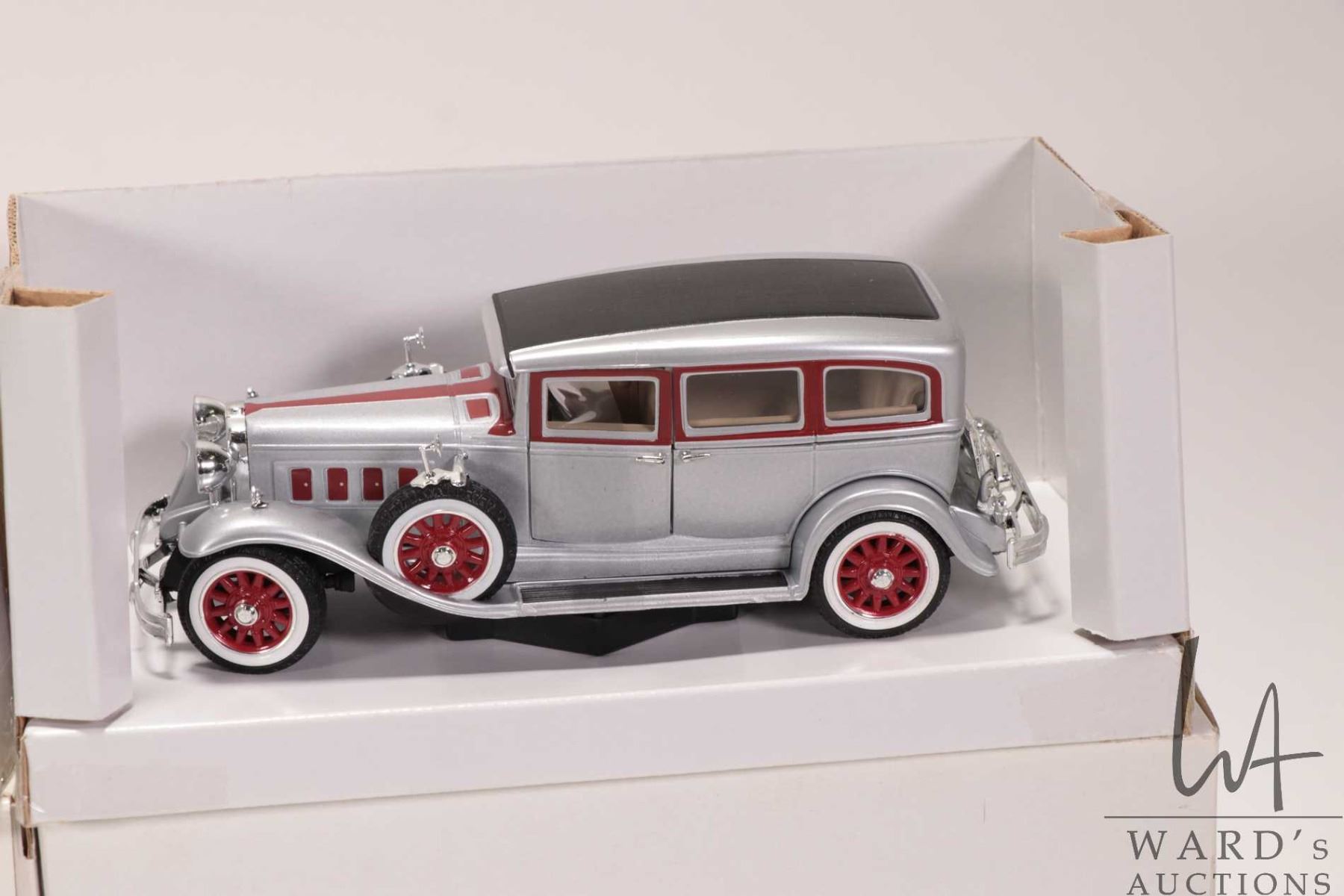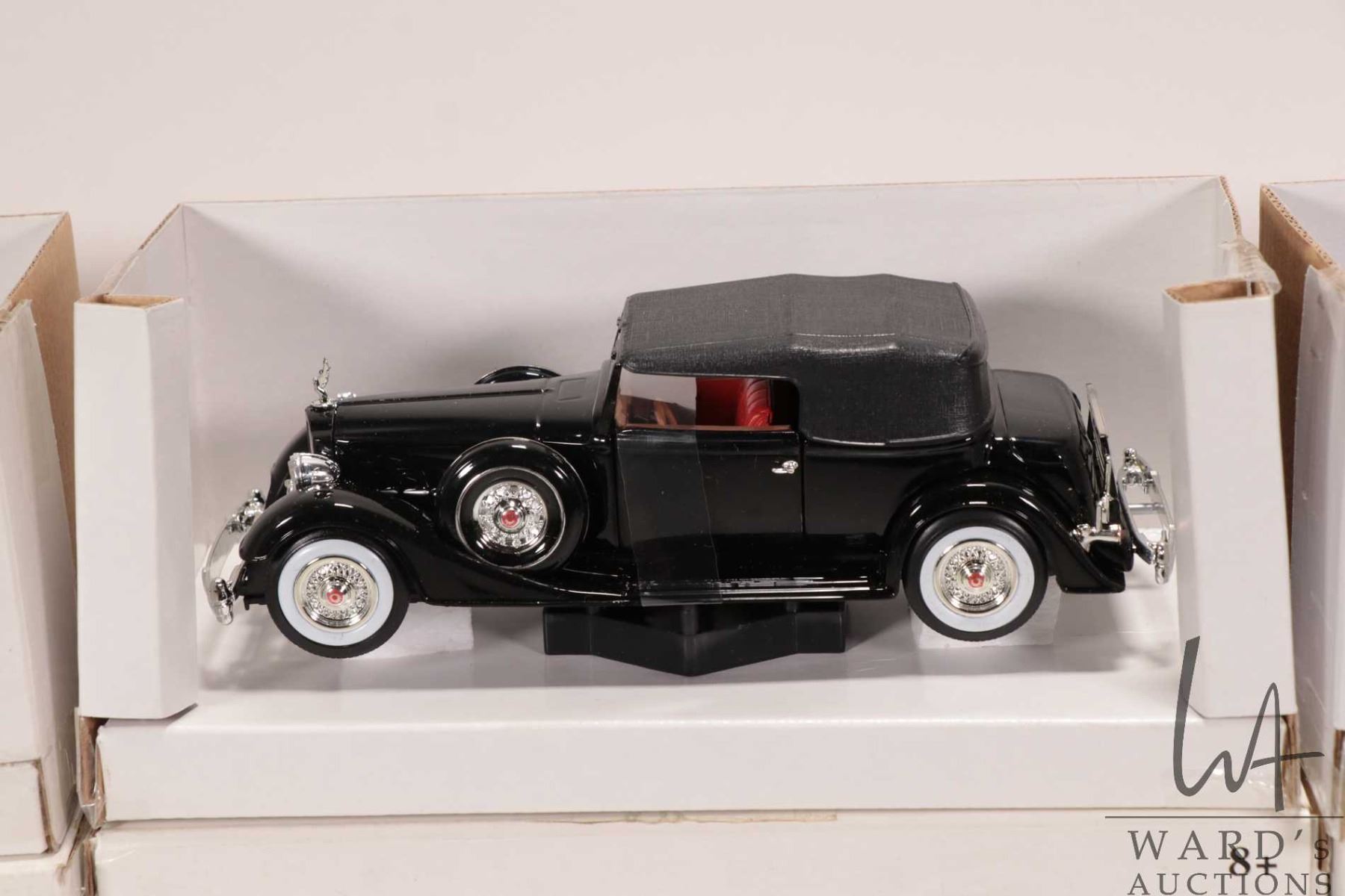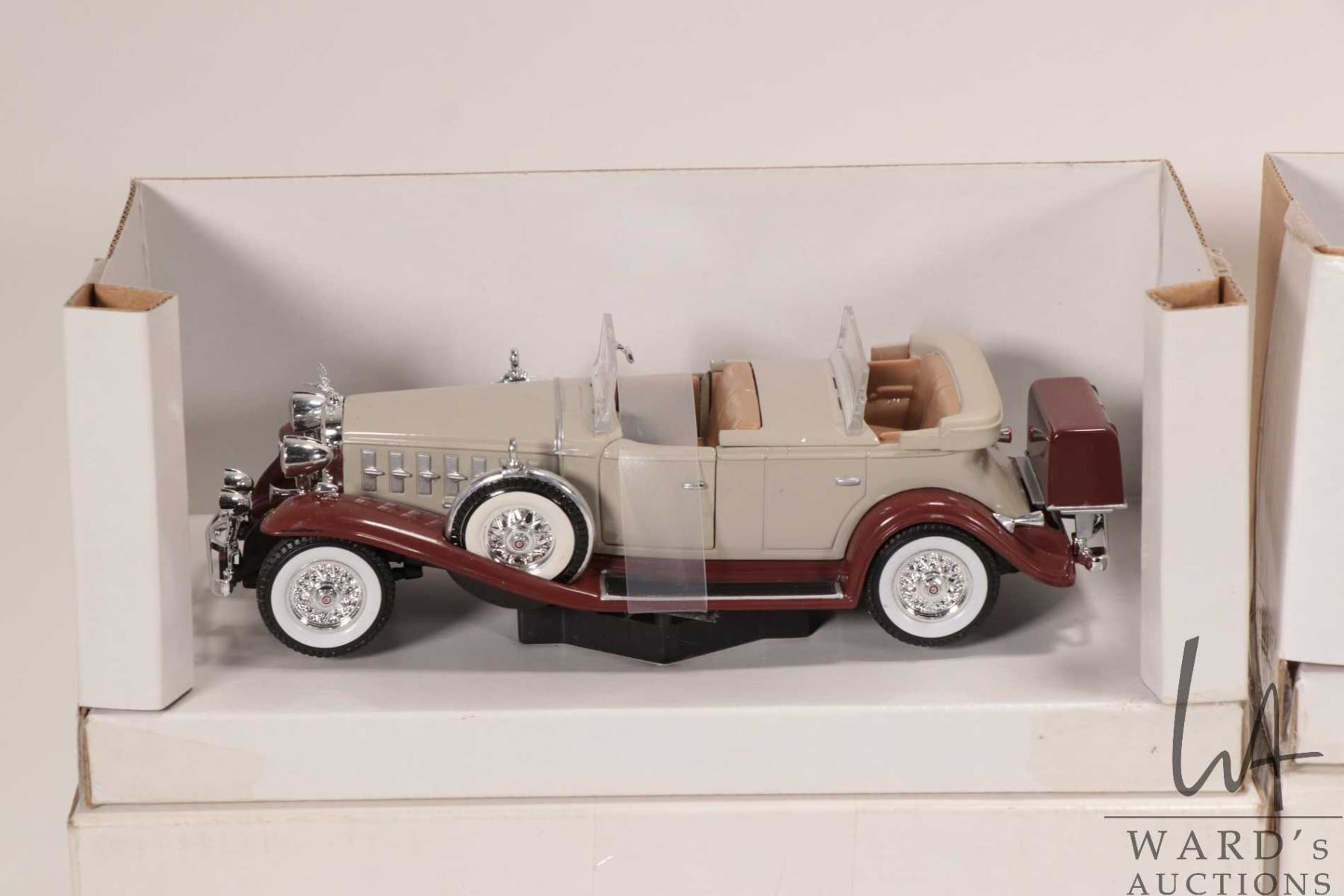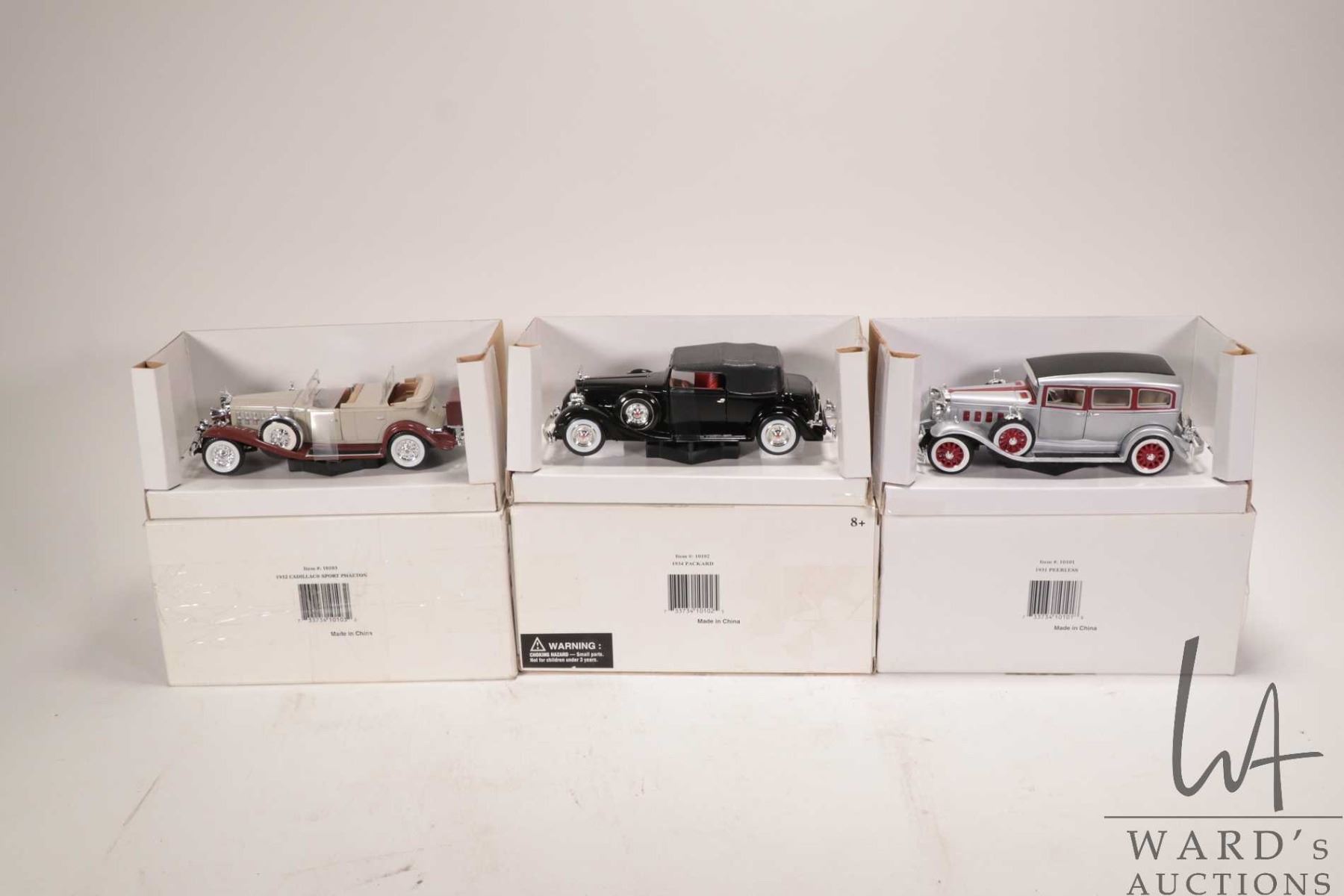 Three 1:32 scale die-cast cars including 1931 Peerless, 1934 Packard and a 1932 Cadaillac Sport Phaeton, all with original boxes