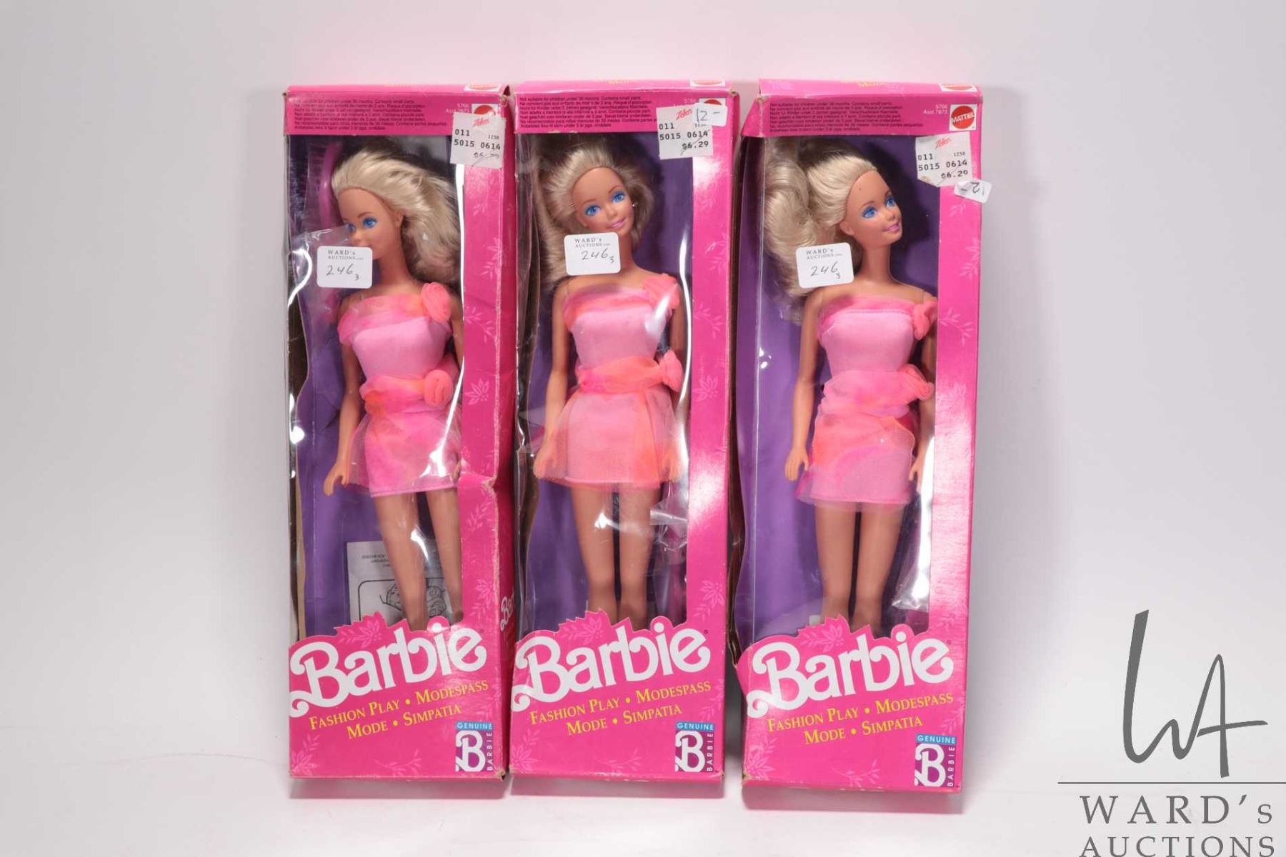 Three 1990 Barbie Fashion Play dolls in original packaging