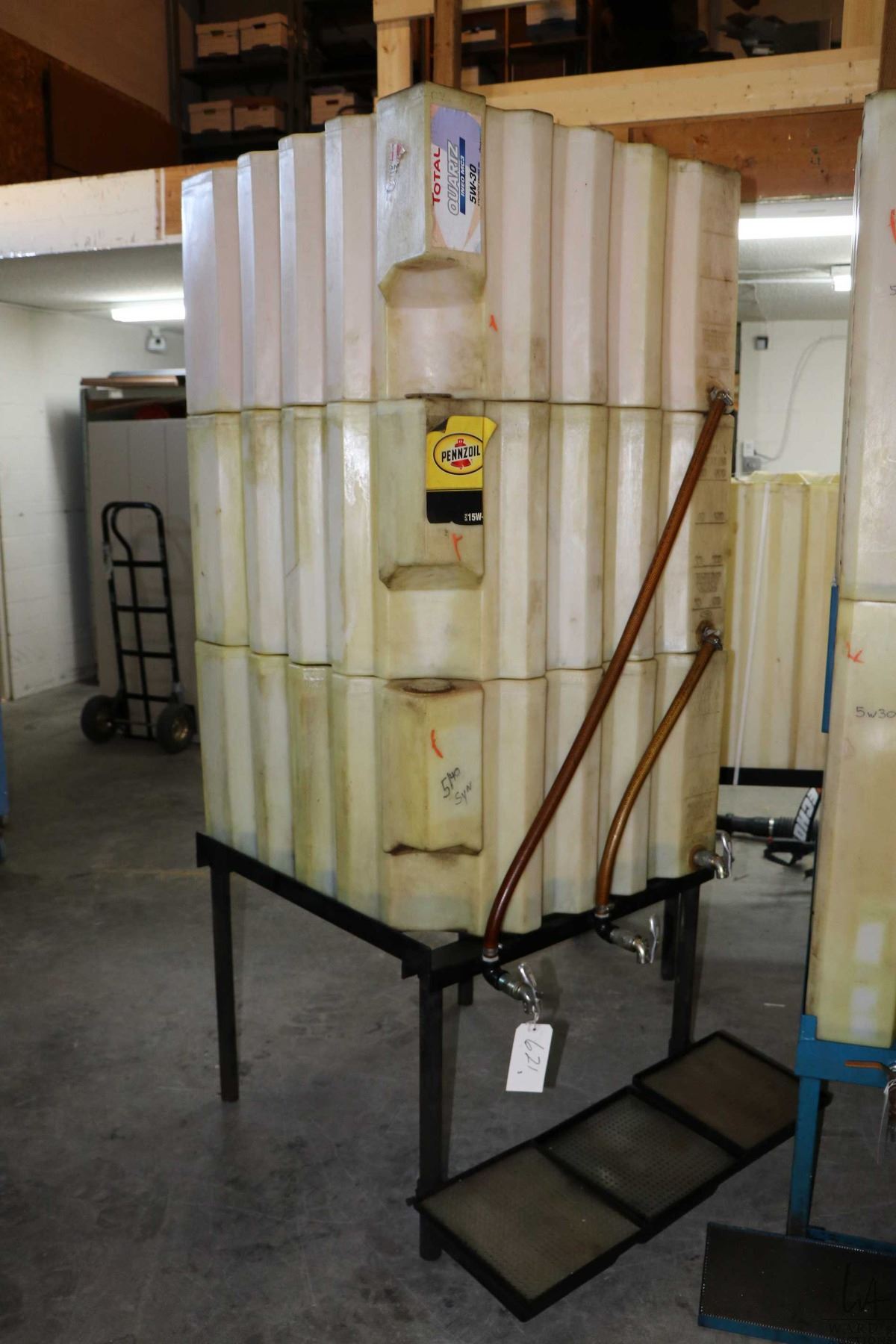 Three 265 ltr. oil containers on metal stand with what appears to be over 30 ltrs. of 5/40 synthetic in bottom container, Mid container with minor amount of 540 Pennzoil and top container marked Quartz 5W30 with minor amount of product. Note: In operation up to a month ago in local shop. No reason to think there is any contamination issues