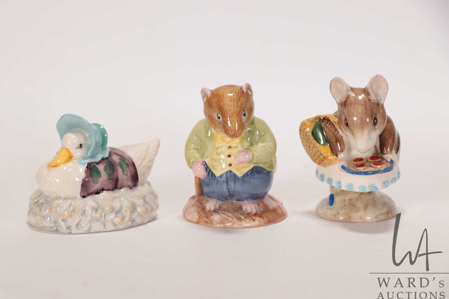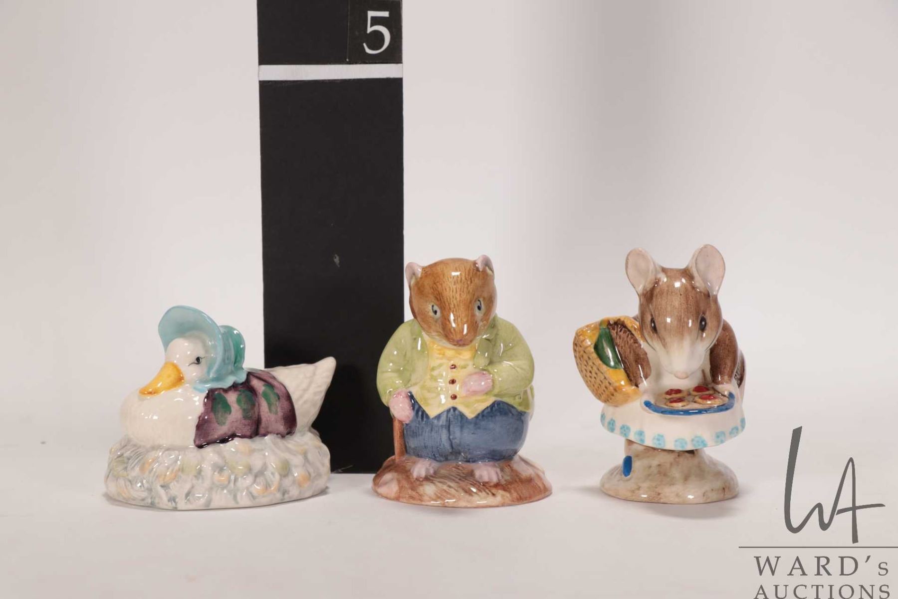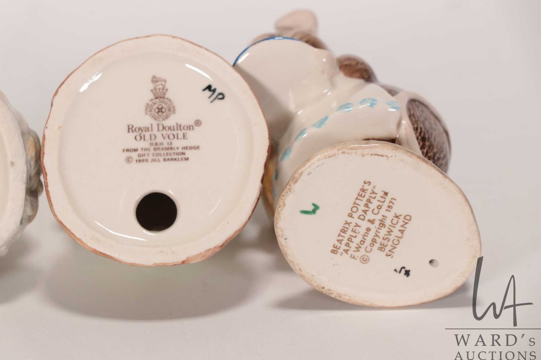 Three Beatrix Potter figurines including Beswick Appley Dapply, Jemina Puddleduck and 3" Royal Doulton Old Vole,