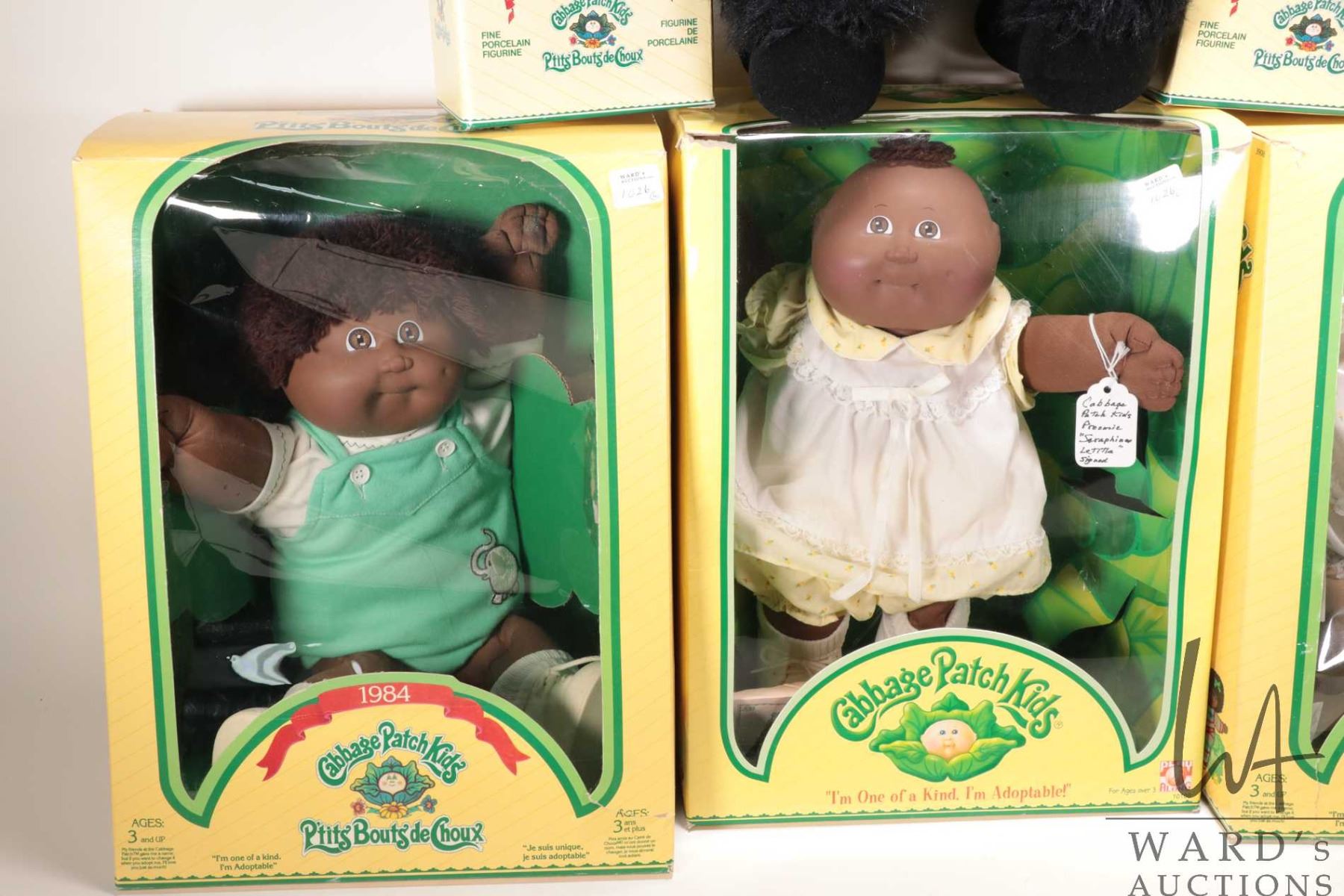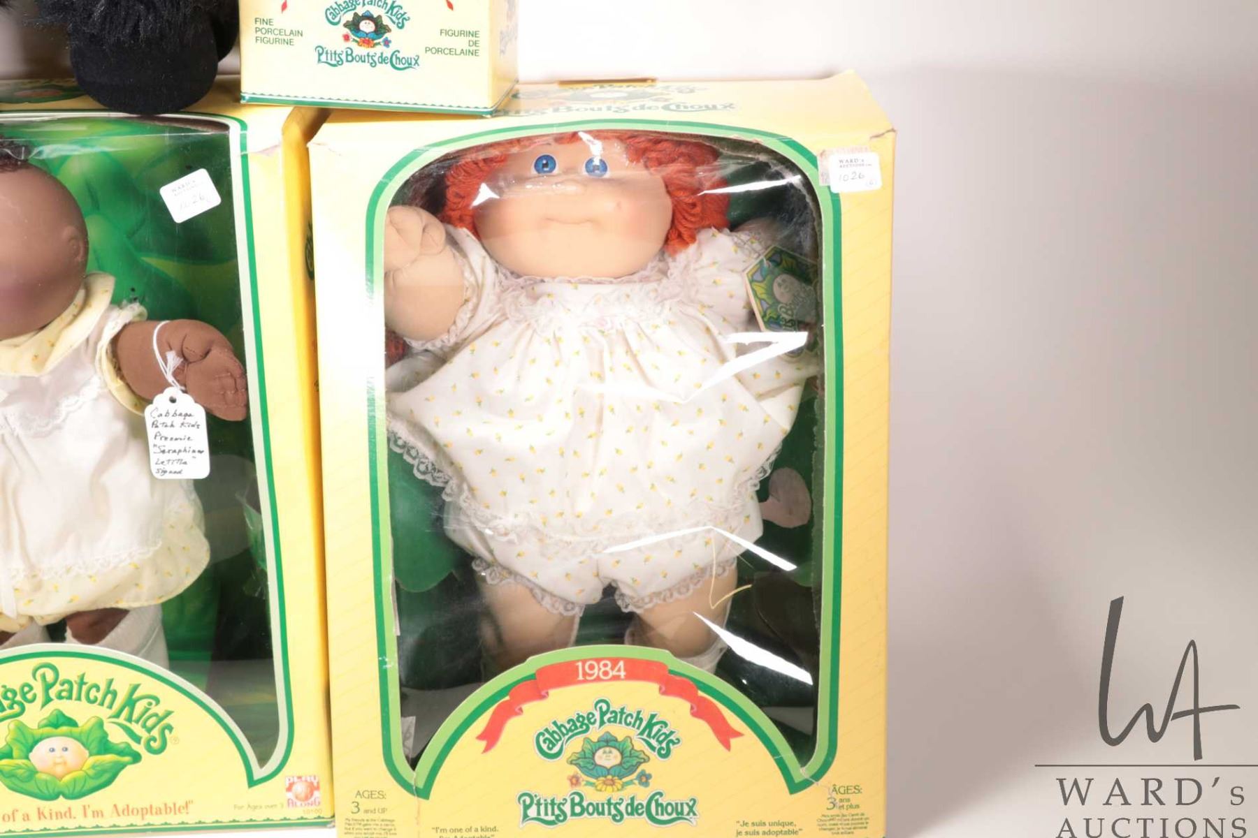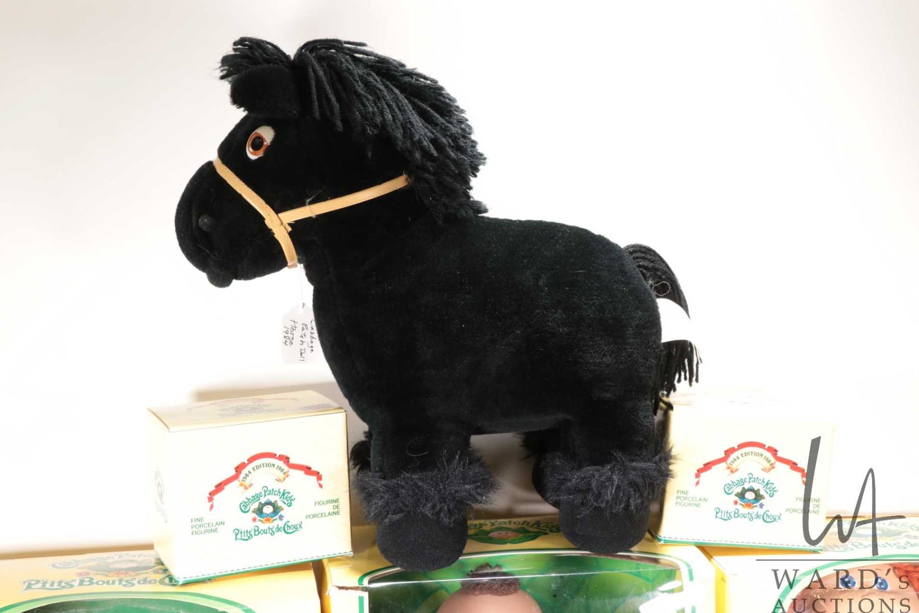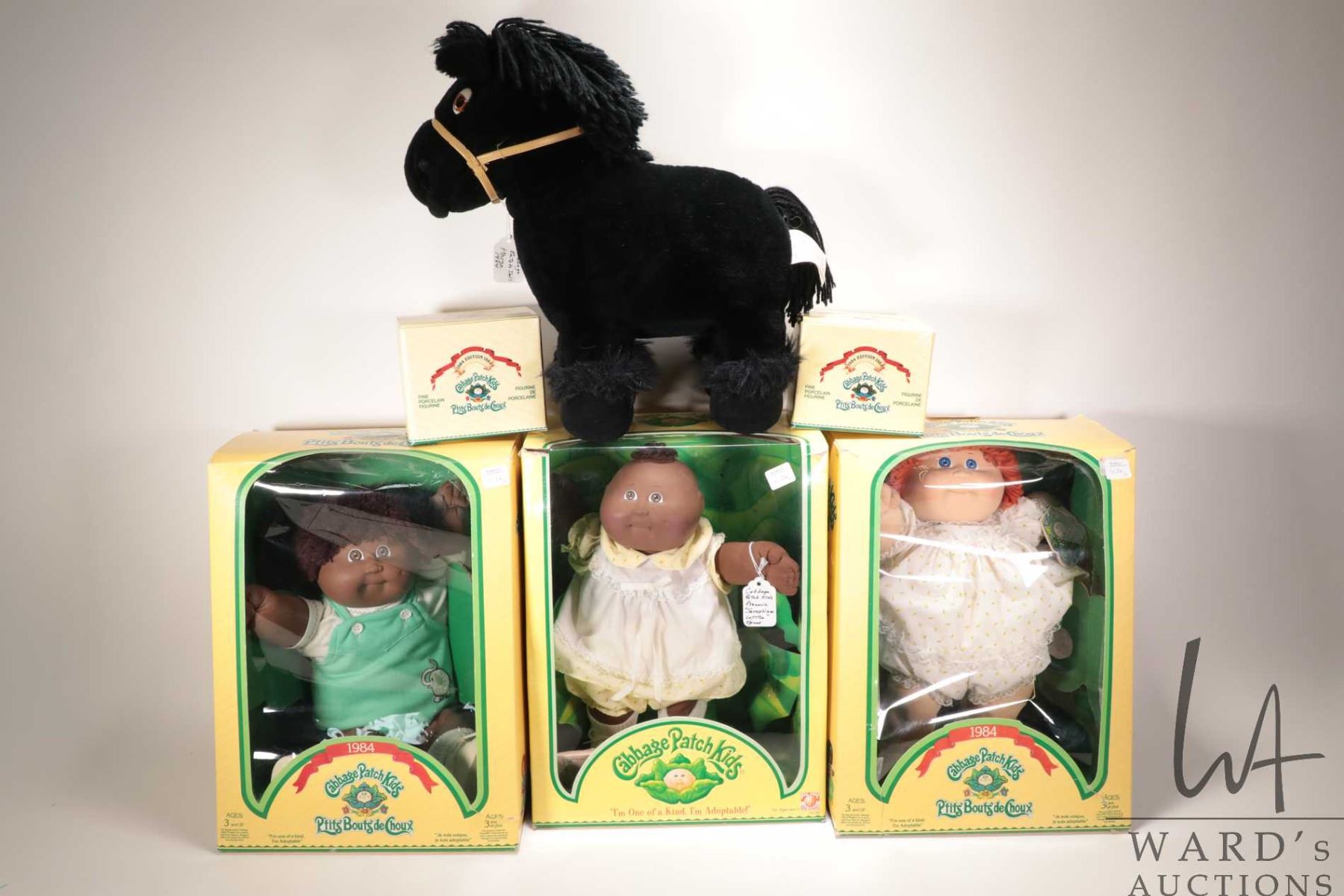 Three Cabbage Patch kids, a Cabbage Patch horse and two boxed porcelain figurines