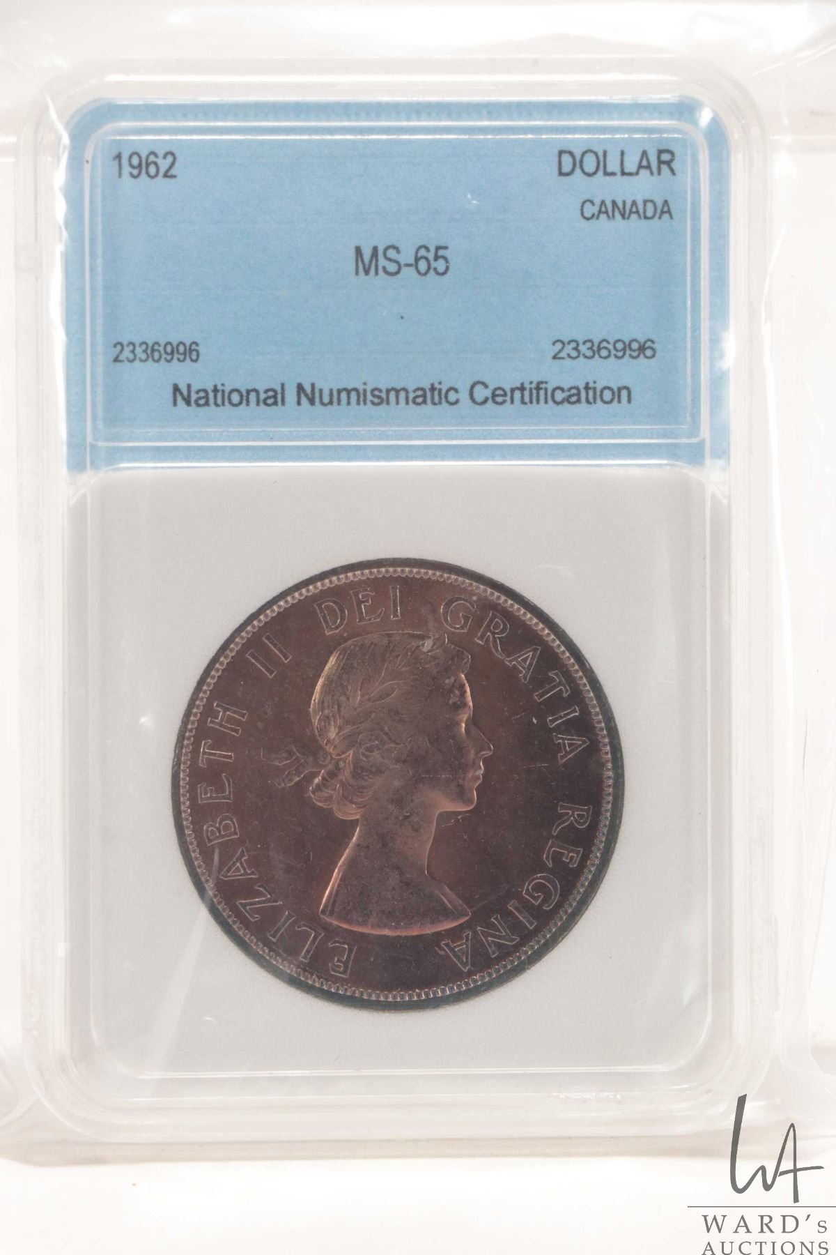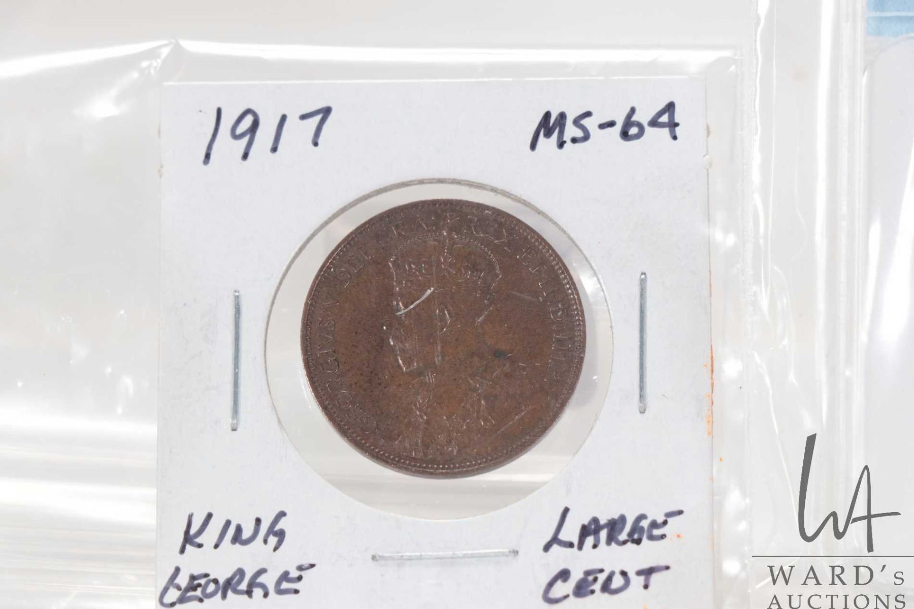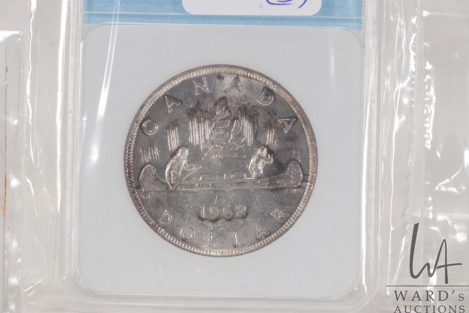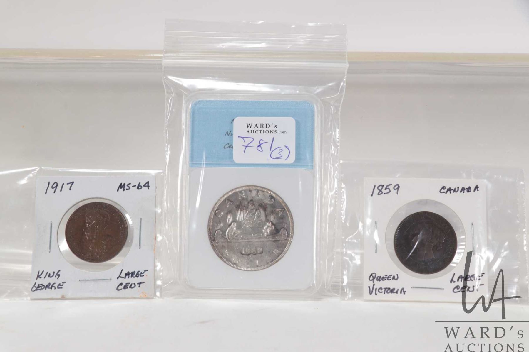 Three Canadian coins including 1962 silver dollar 1917 King George large cent, and 1859 Queen Victor