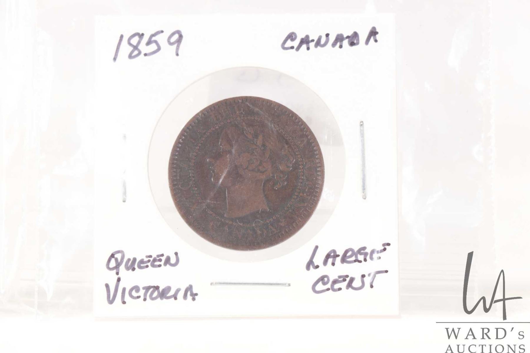 Three Canadian coins including 1962 silver dollar 1917 King George large cent, and 1859 Queen Victoria large cent