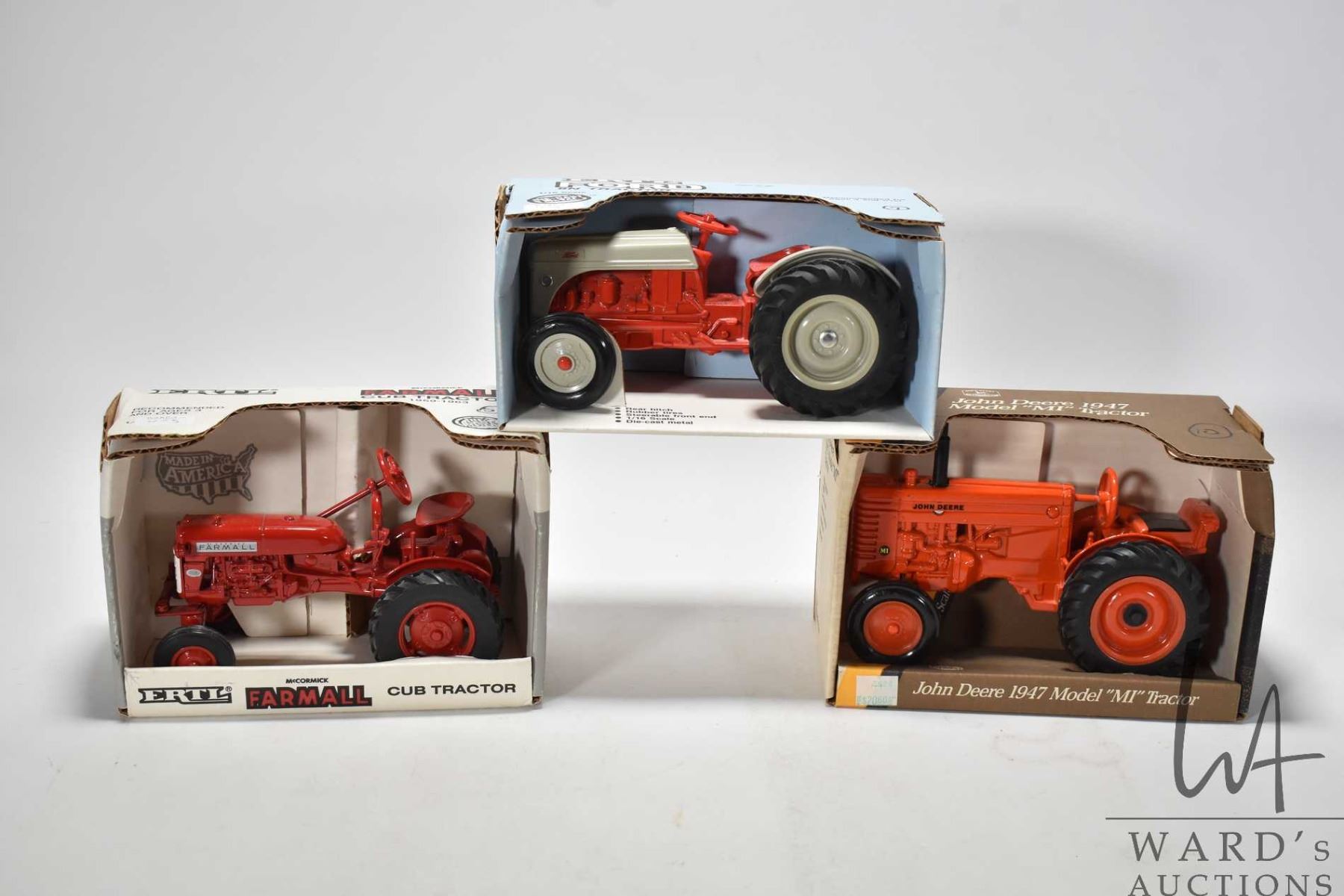 Three Ertl 1:16 scale die cast toys including Ford 8N, John Deere 1947 model MI and Farmall Cub tractor