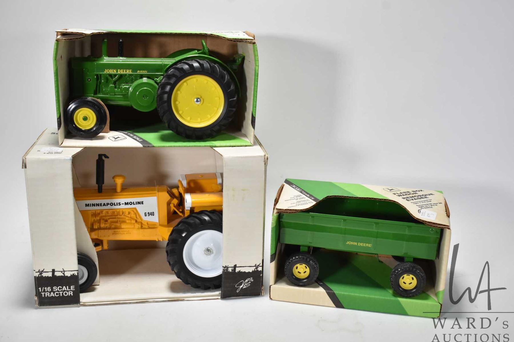 Three Ertl 1:16 scale die cast toys including John Deere model R diesel, Minneapolis Moline G940 and John Deere Flare Box Wagon