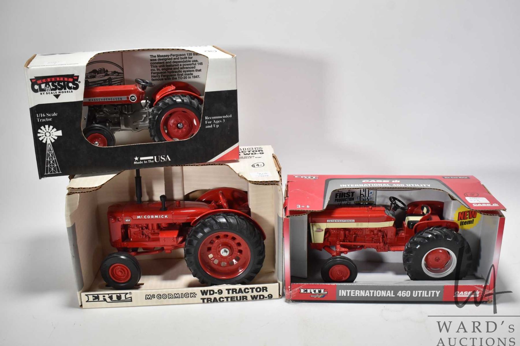 Three Ertl 1:16 scale die cast toys including Massey-Ferguson 135, International 460 Utility and McCormick WD-9