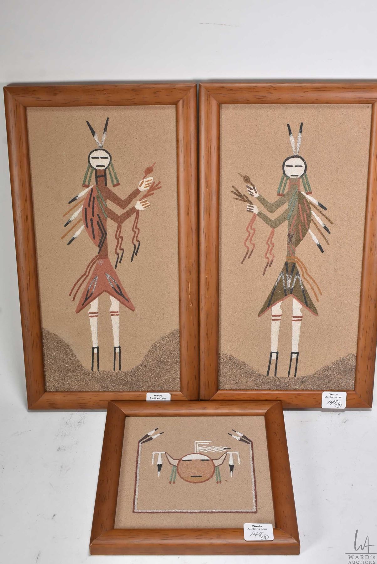 Three First Nations motif sandpaintings including two 11 1/2" X 5 1/2" and one 5 1/2" X 5 1/2"