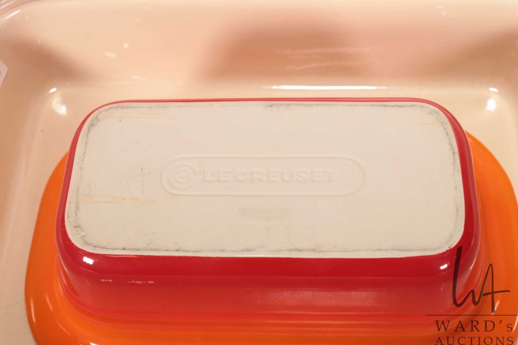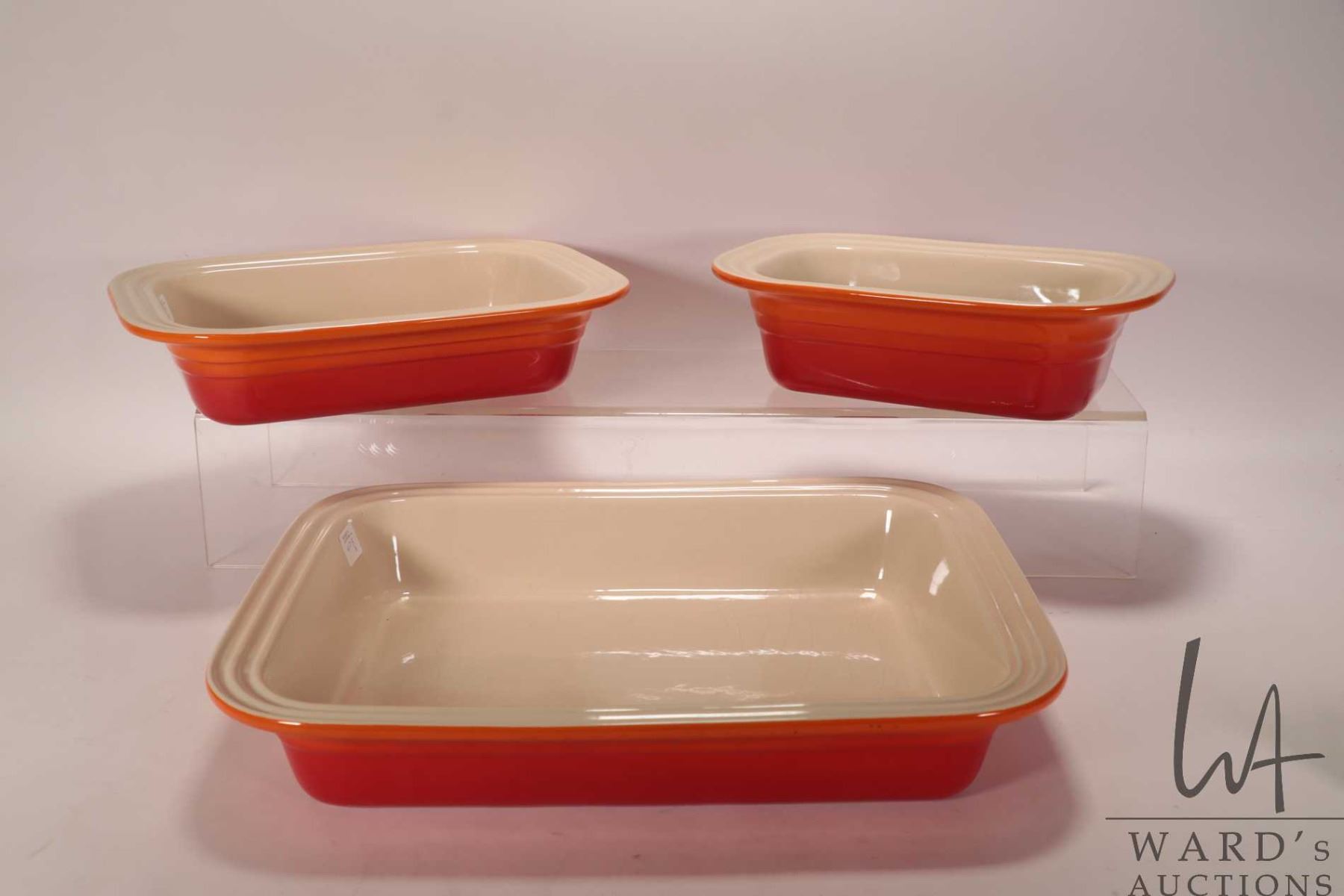 Three Le Creuset stoneware baking dishes including loaf pan, 12" casserole dish and a 15" lasagna pa