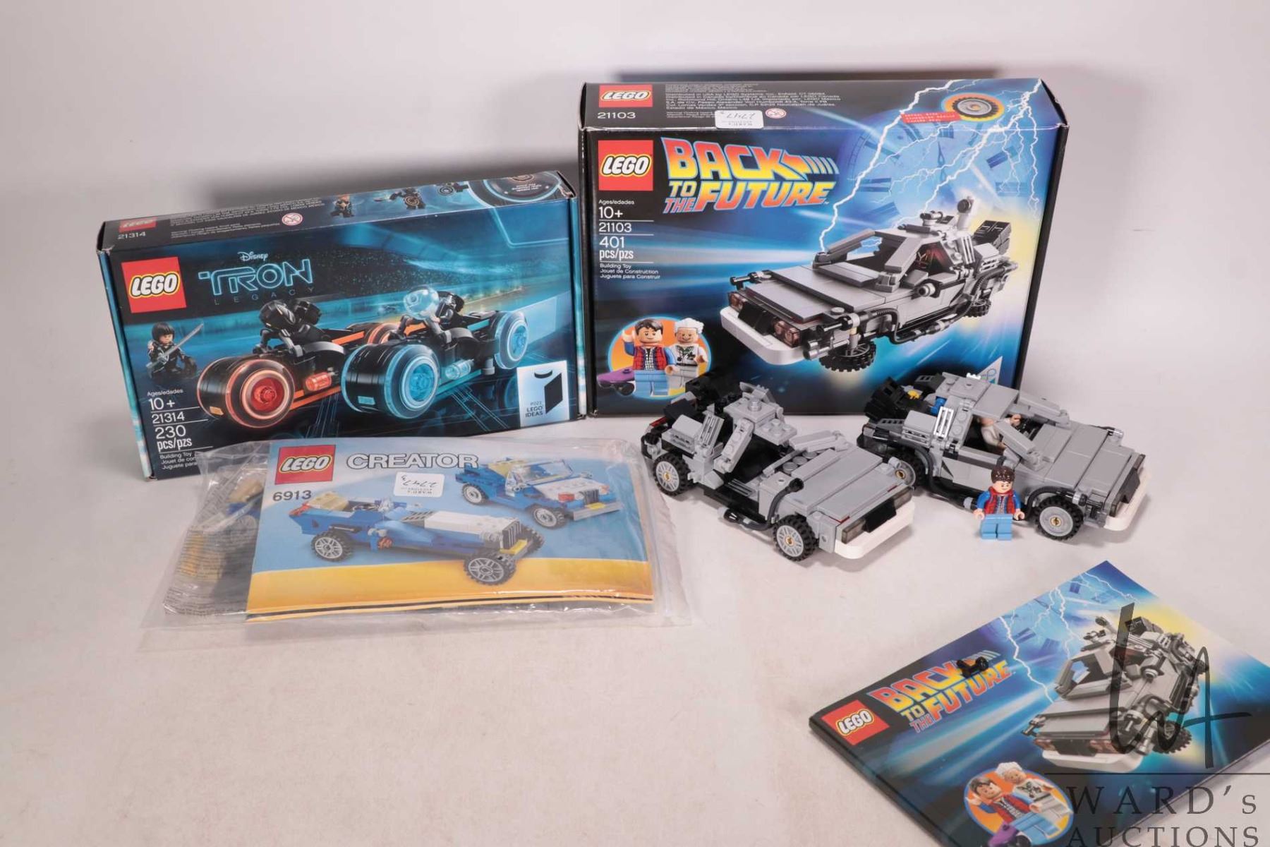Three Lego kits including factory sealed "Disney Tron Legacy "no. 21314 kit, Lego "Back to the Future" no. 21103 DeLorean Time Machine with two vehicles, manual and Minifigures, Lego "Creator" no. 6913 vehicles. Completeness not confirmed or guaranteed. Bid accordingly