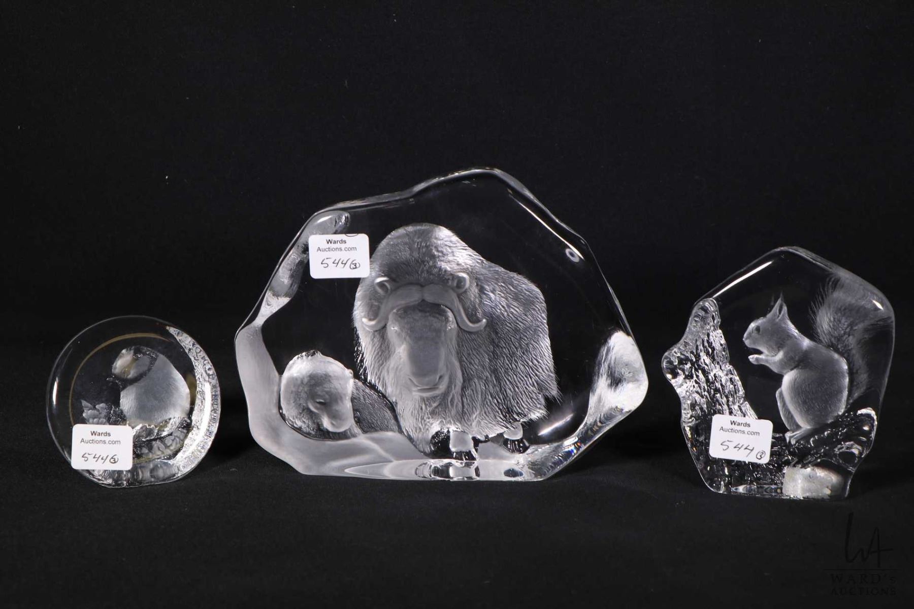 Three Mats Jonasson lead crystal wildlife sculptures including 5" limited edition water buffalo 893/4000, a squirrel and a small song bird