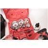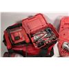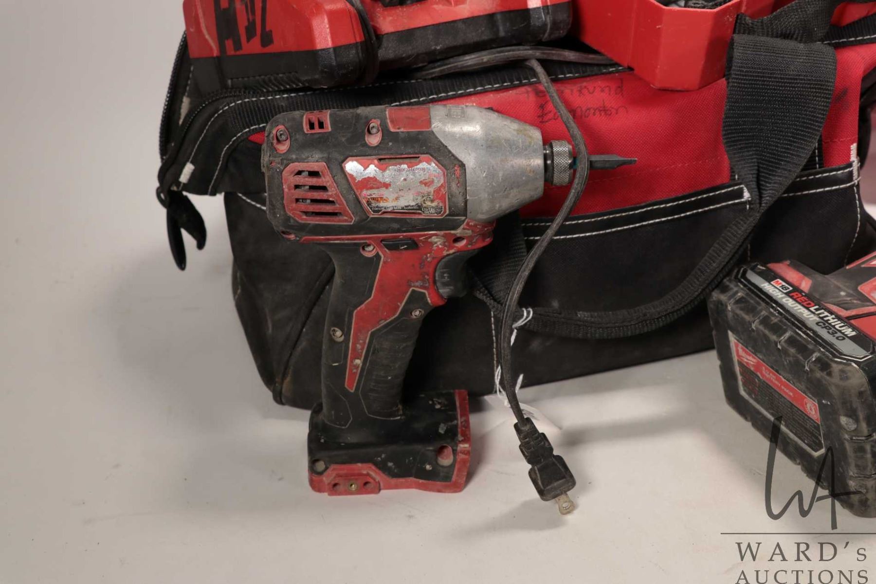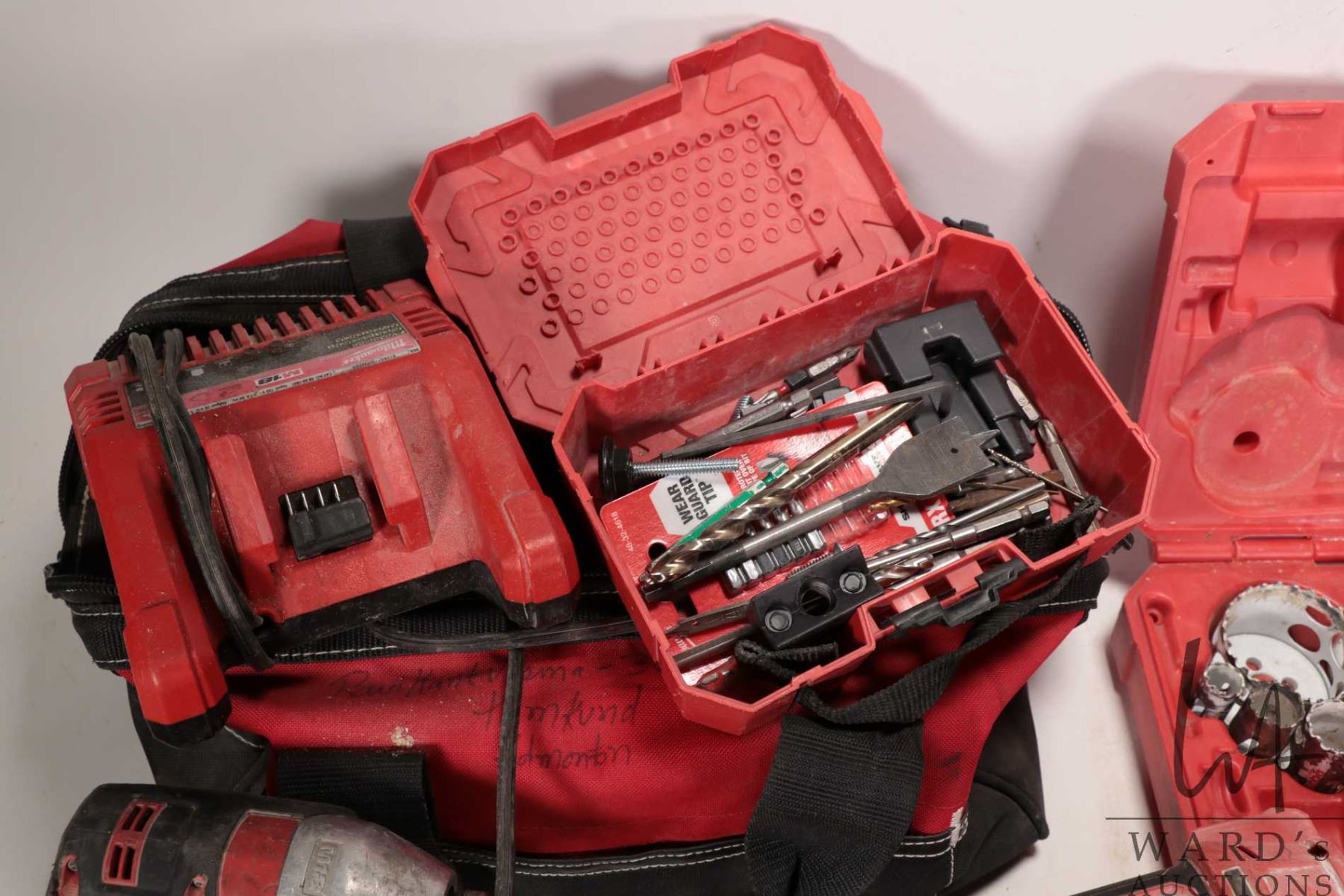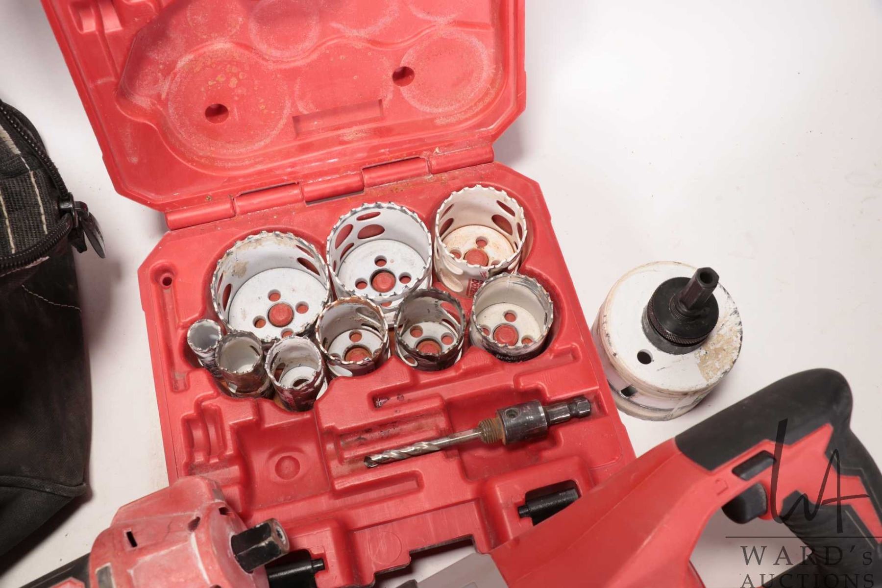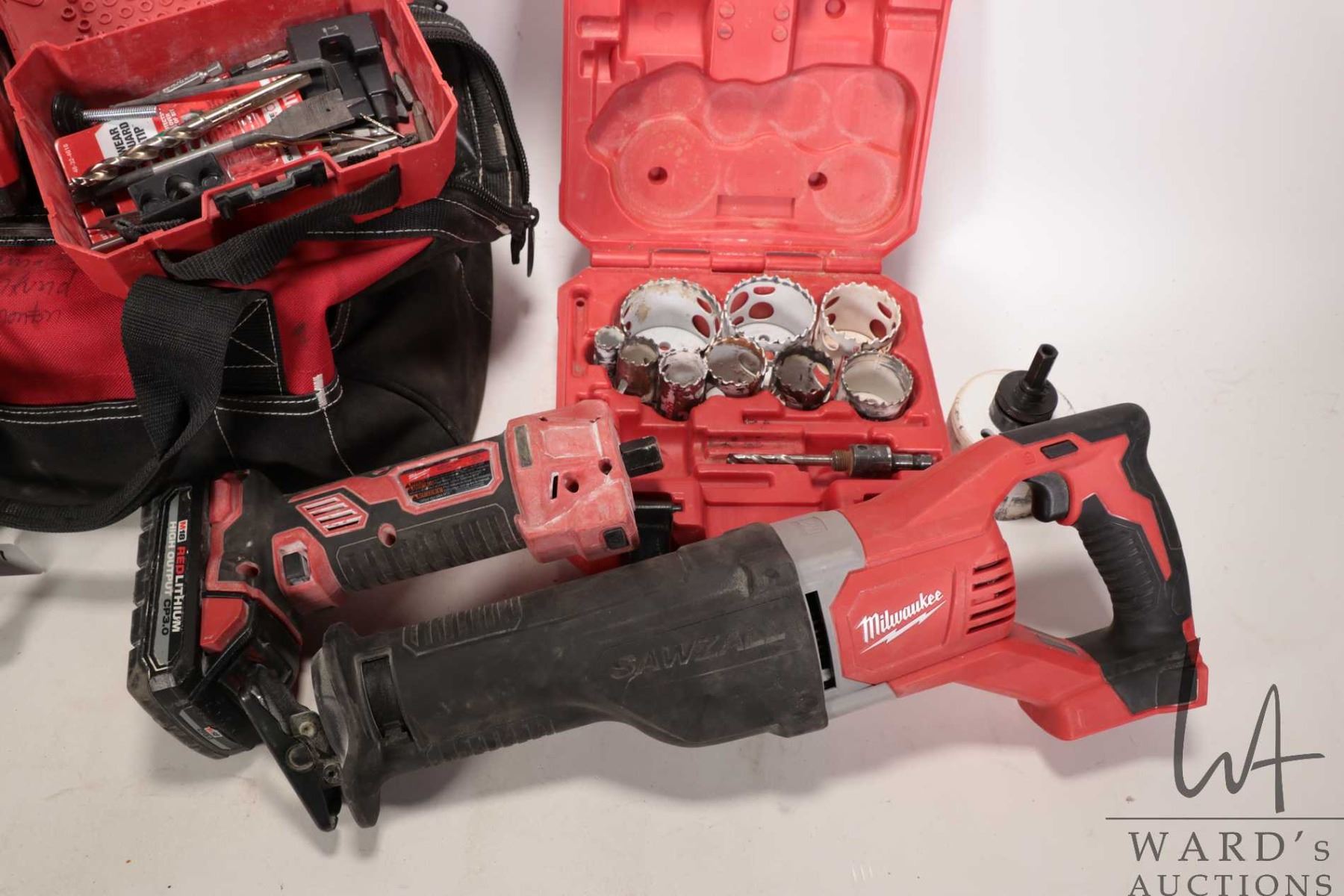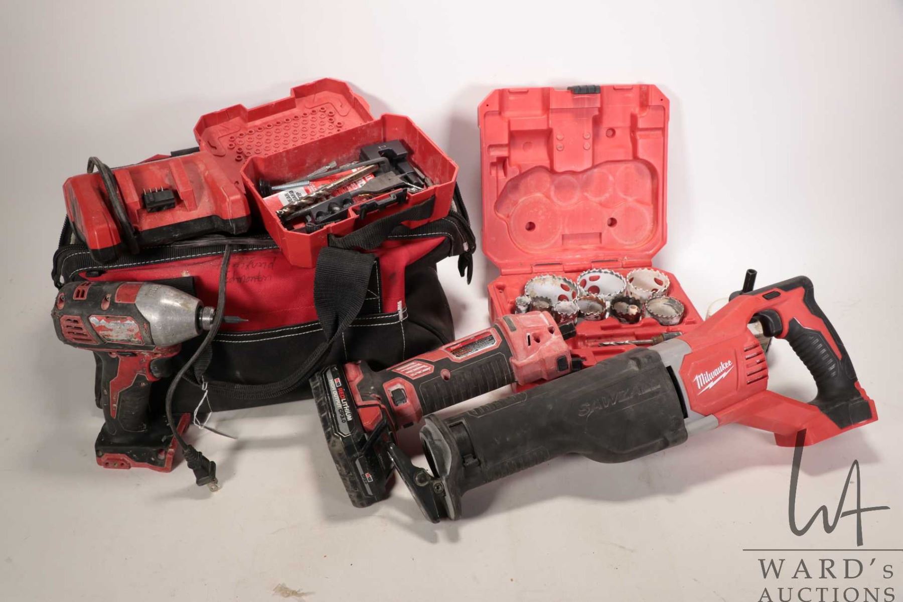 Three Milwaukee cordless power tools including driver, cut out saw and reciprocating saw, includes one battery, charger, case of accessories and tool bag, all working