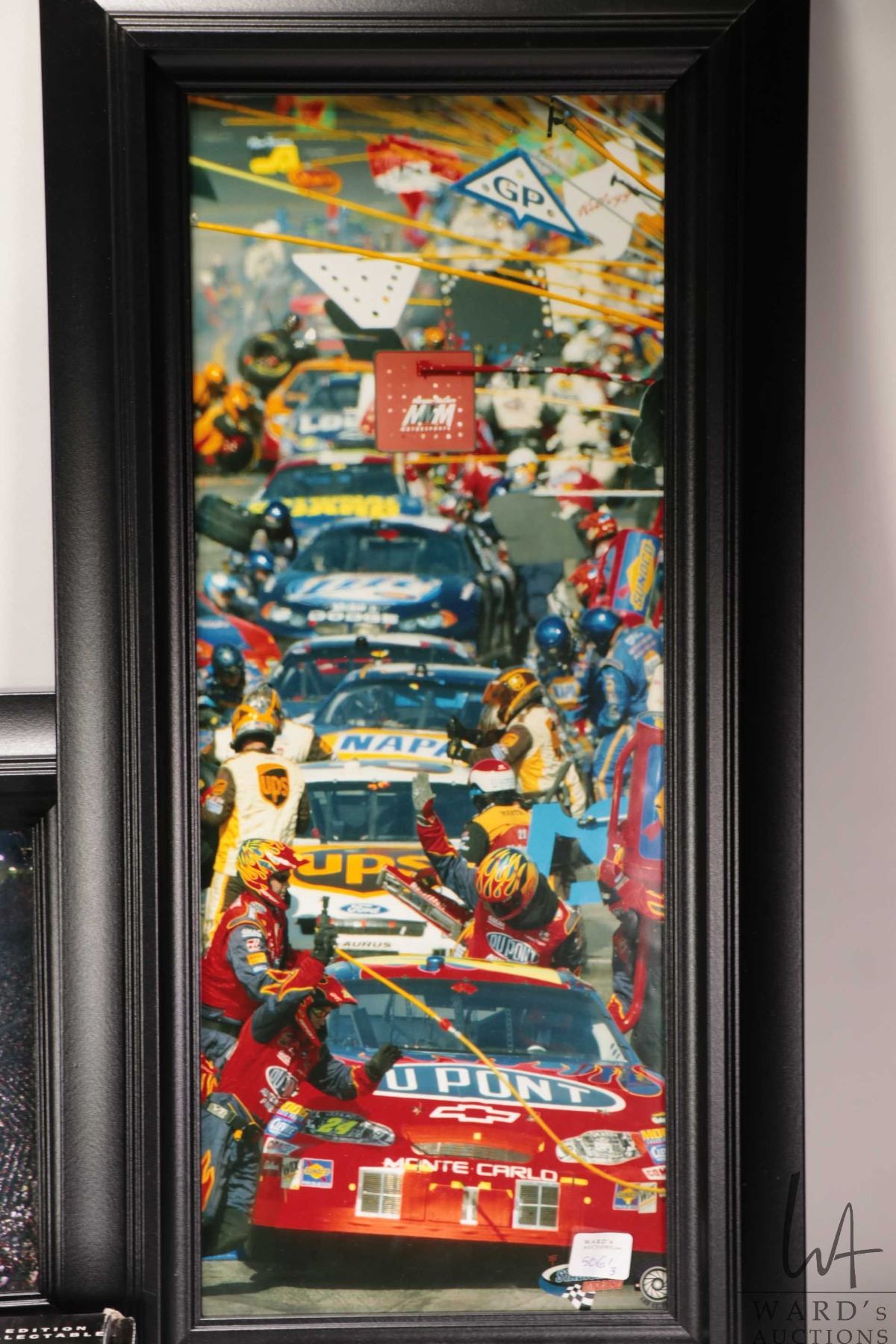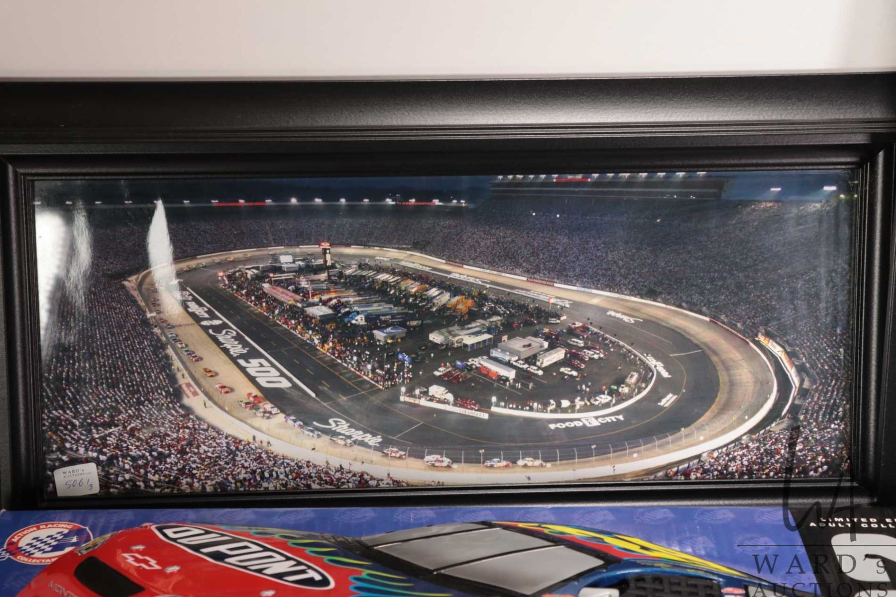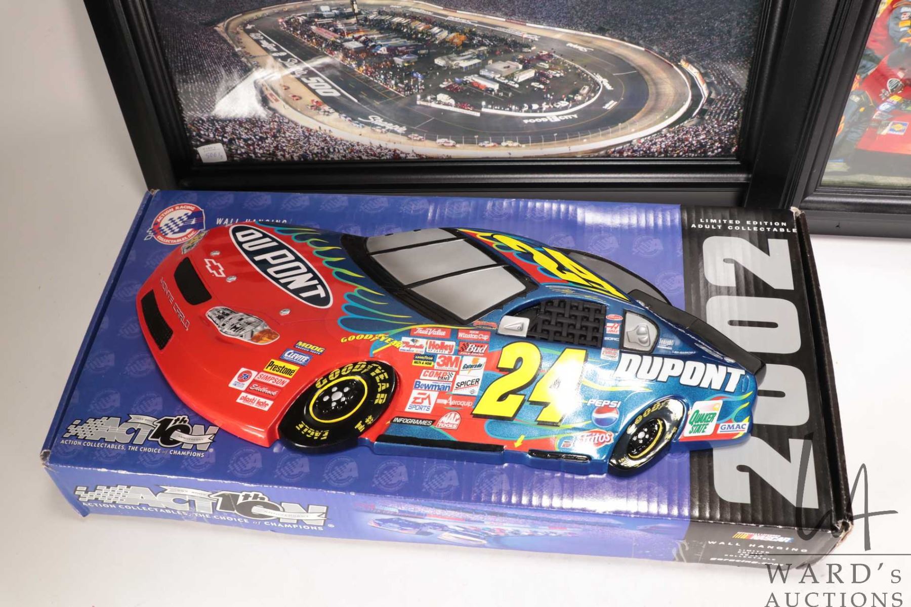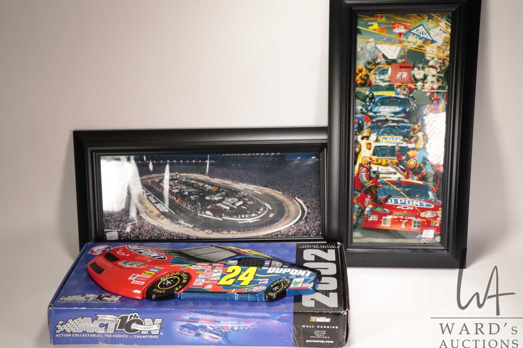 Three Nascar collectibles including Action car themed wall display and two framed coloured photographs including Pit-row and a race track