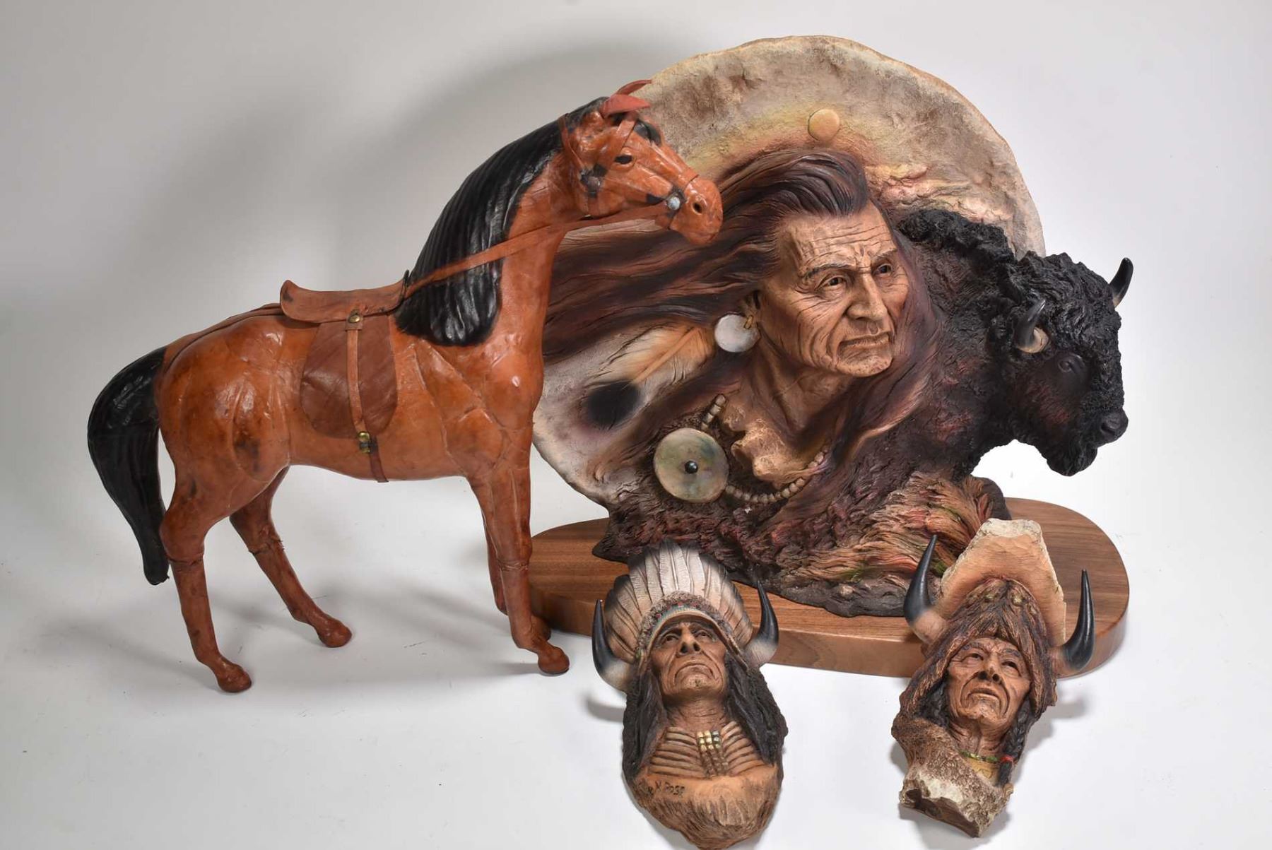 Three Neil Rose resin Indian sculptures including buffalo and chief with wooden base and two wall mount plus a leather wrapped horse 13" in height