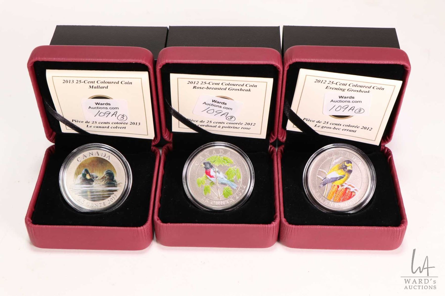 Three Royal Canadian Mint cased coloured coins including 2012 Rose-breasted Grosbeak 25 cent coin, 2013 Mallard 25 cent coin and 2013 Evening Grosbeak 25 cent coin