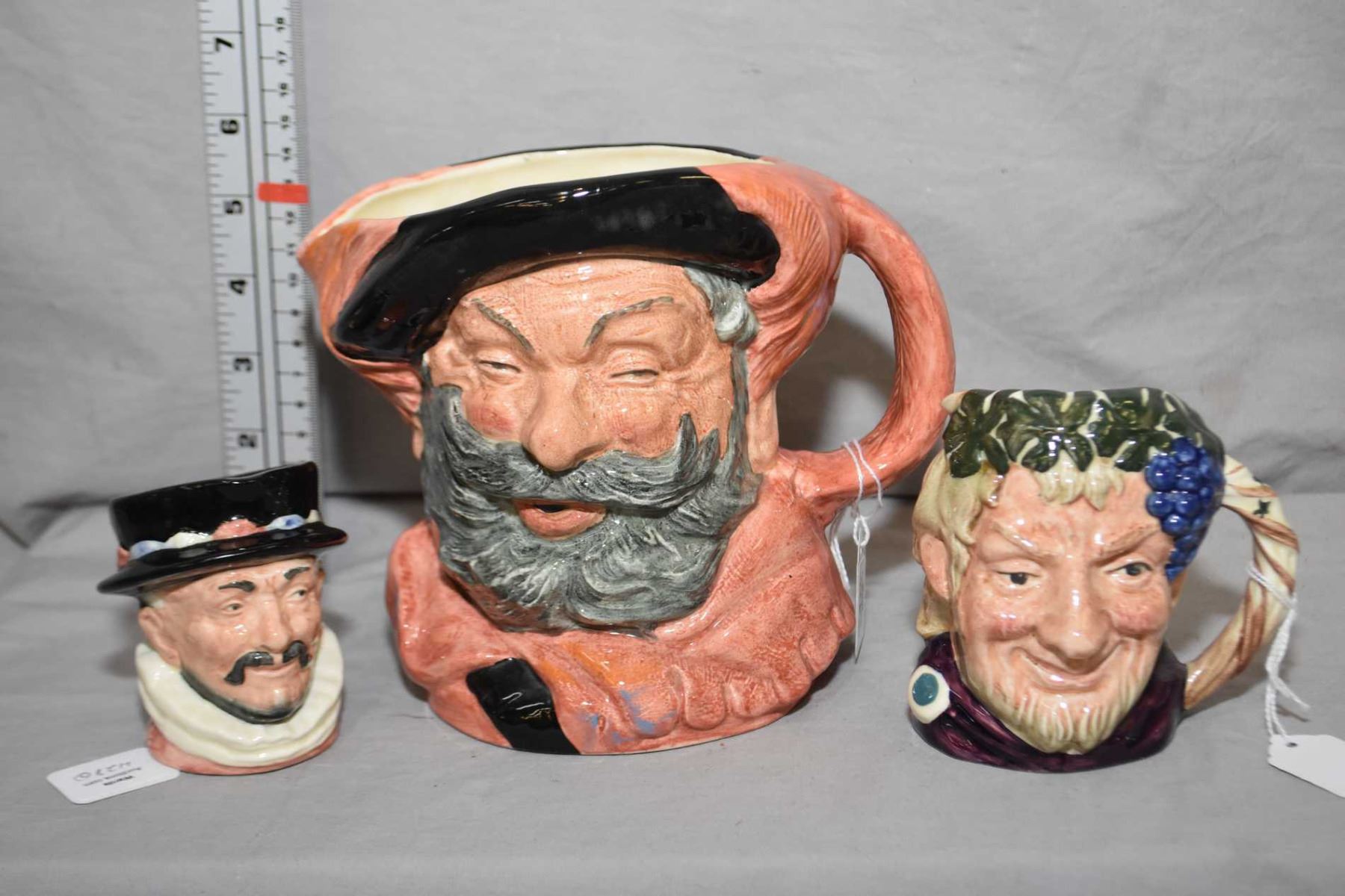 Three Royal Doulton character jugs including two mediums, Bacchus D6505 and Beefeater D6233 plus a large Falstaff D6287