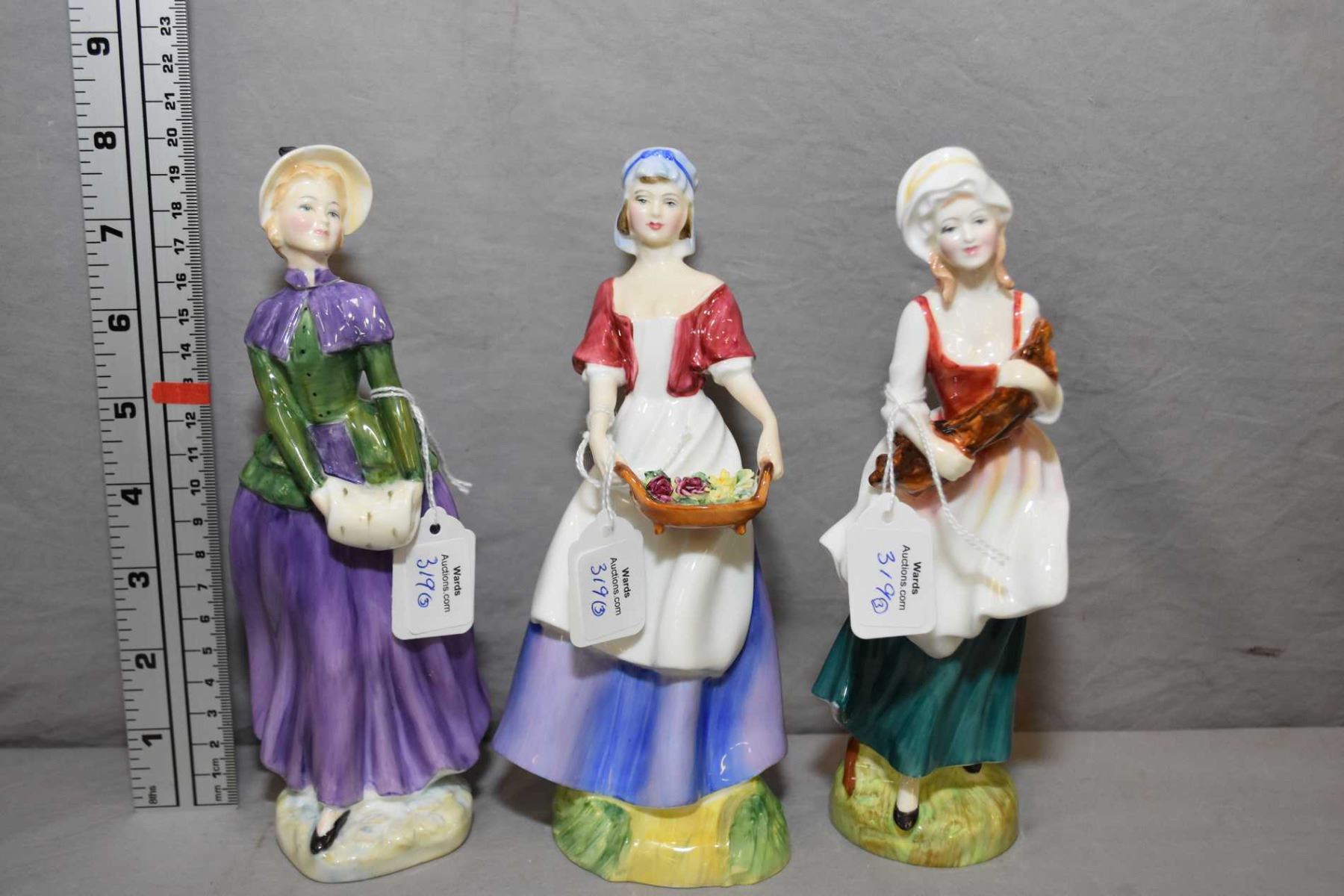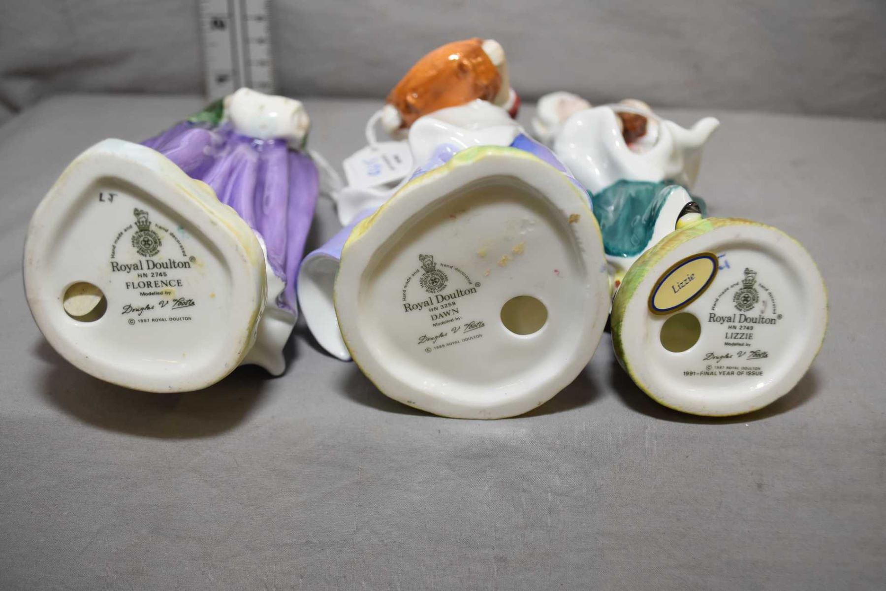 Three Royal Doulton figurines including Lizzie HN2749, Florence HN2745 and Dawn HN3258