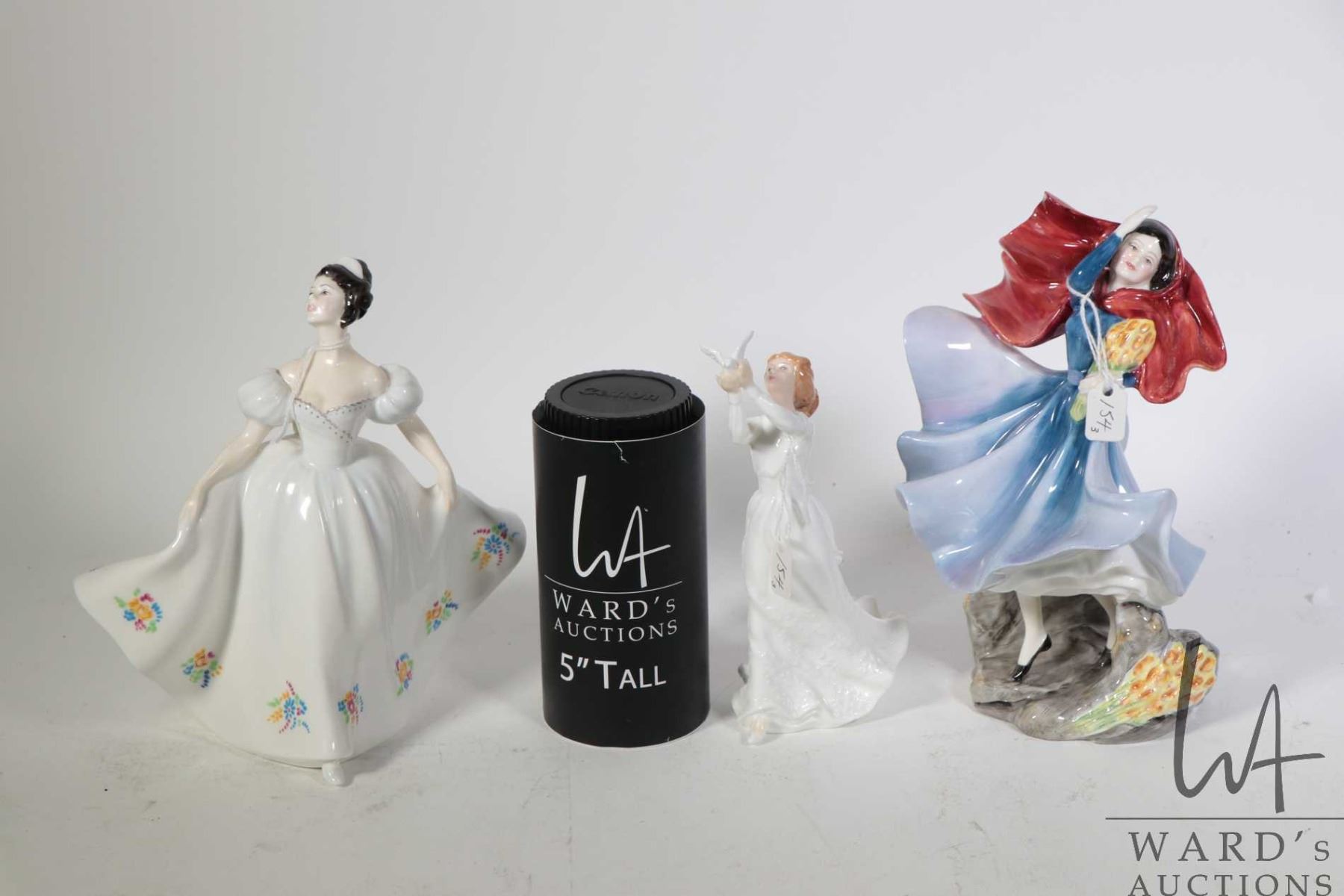 Three Royal Doulton figurines including Sophia HN3257, Kate HN2389 and Thinking of You HN3124