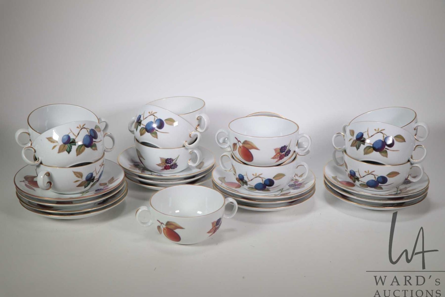 Three Royal Worcester Evesham Gold bouillon bowls with drips trays. Note: Not available for shipping. Local pickup only