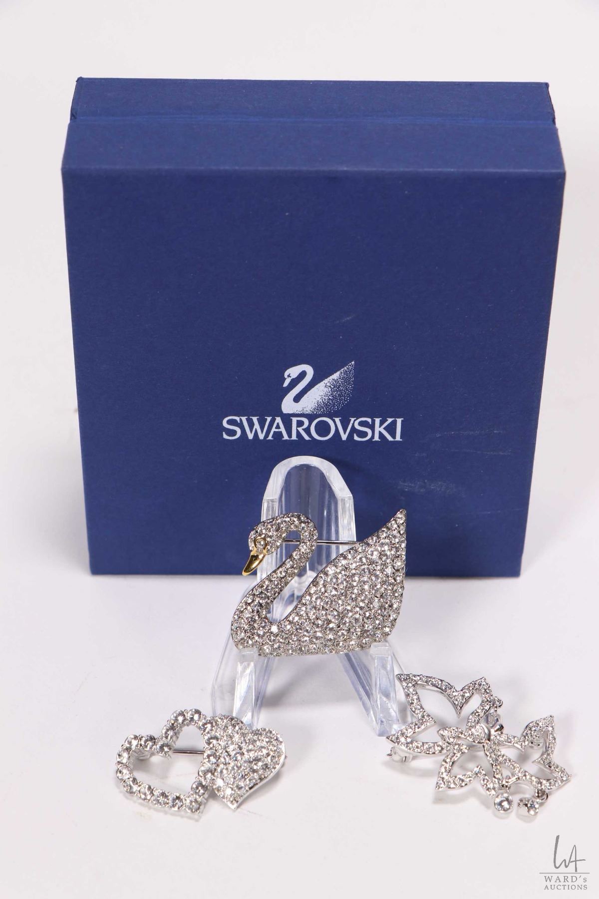 Three Swarovski crystal brooches including swan, three leaf brooch and a double heart brooch