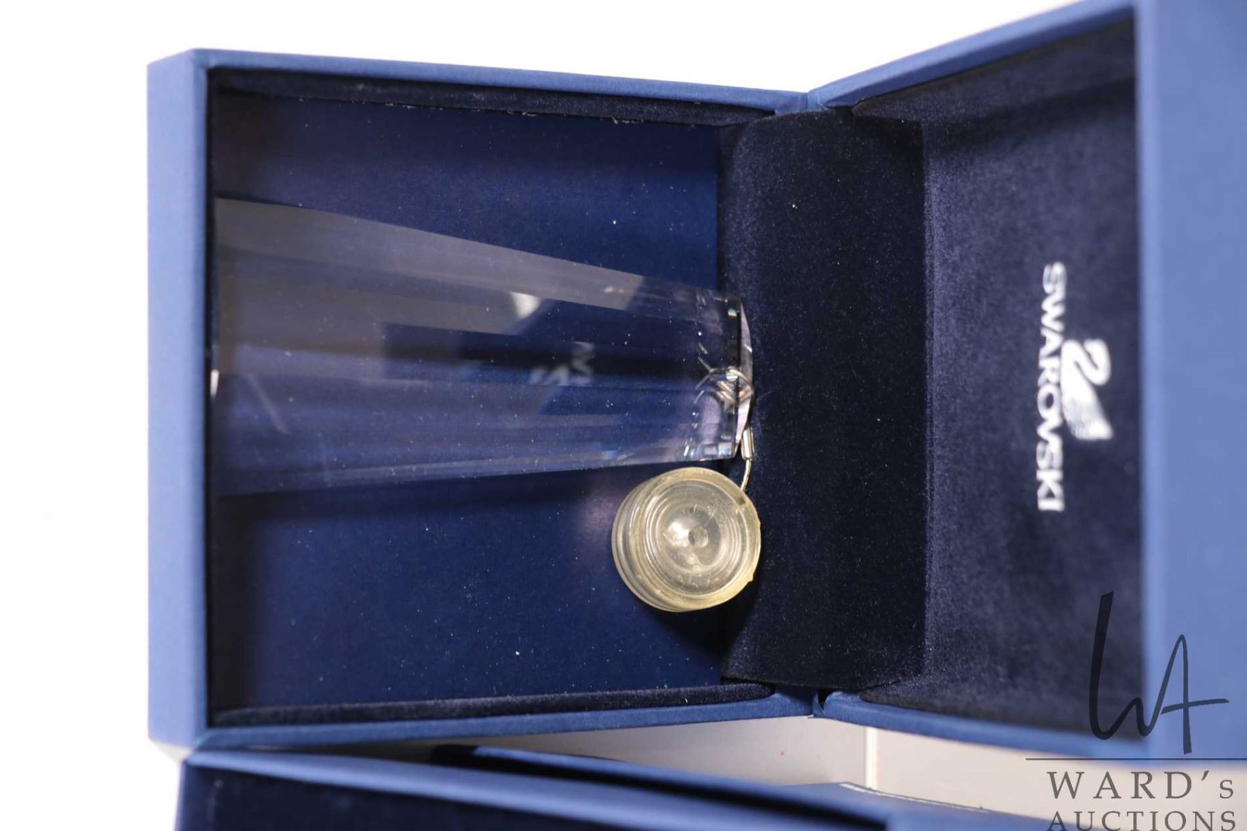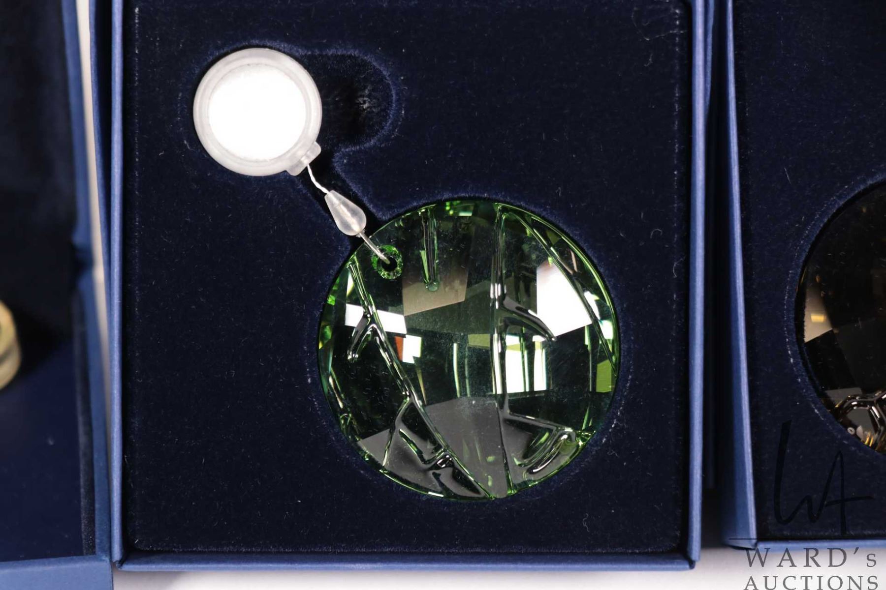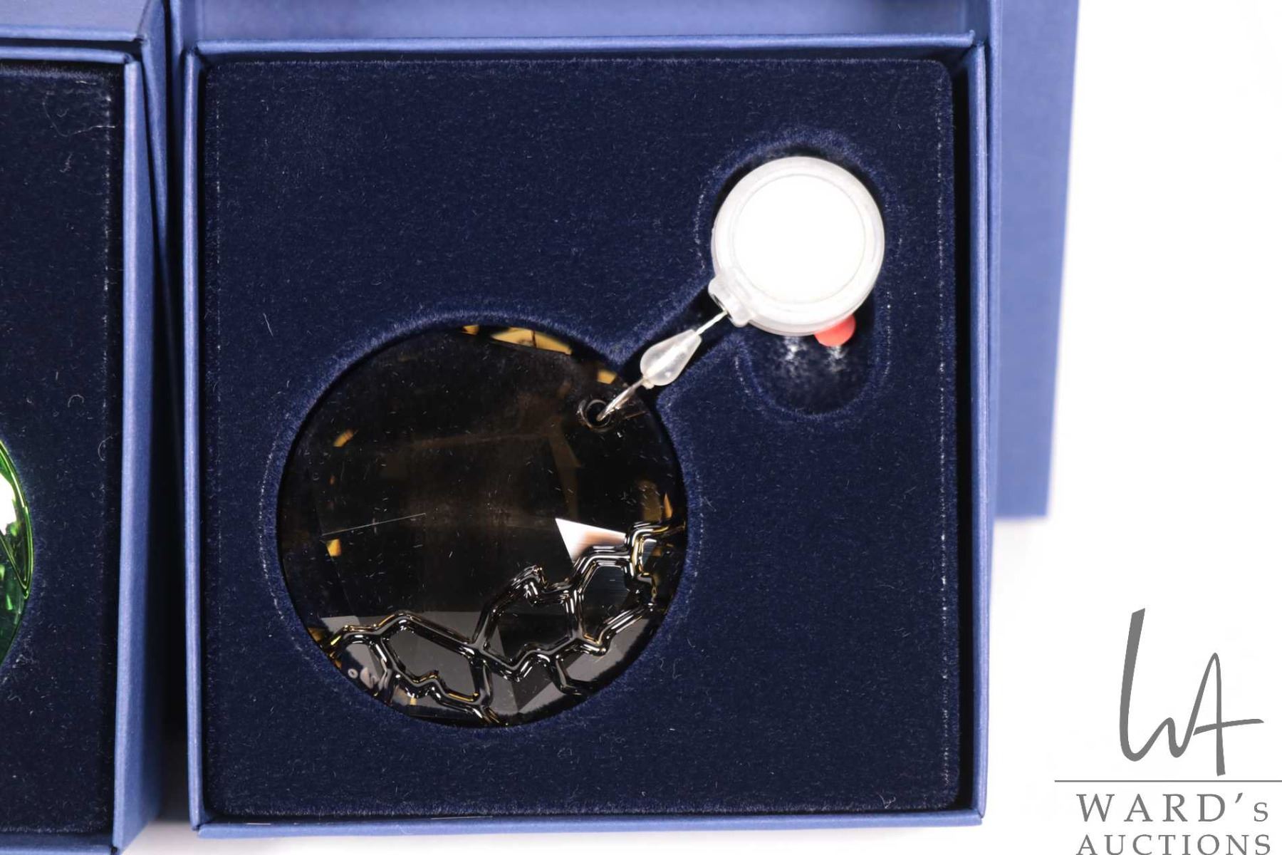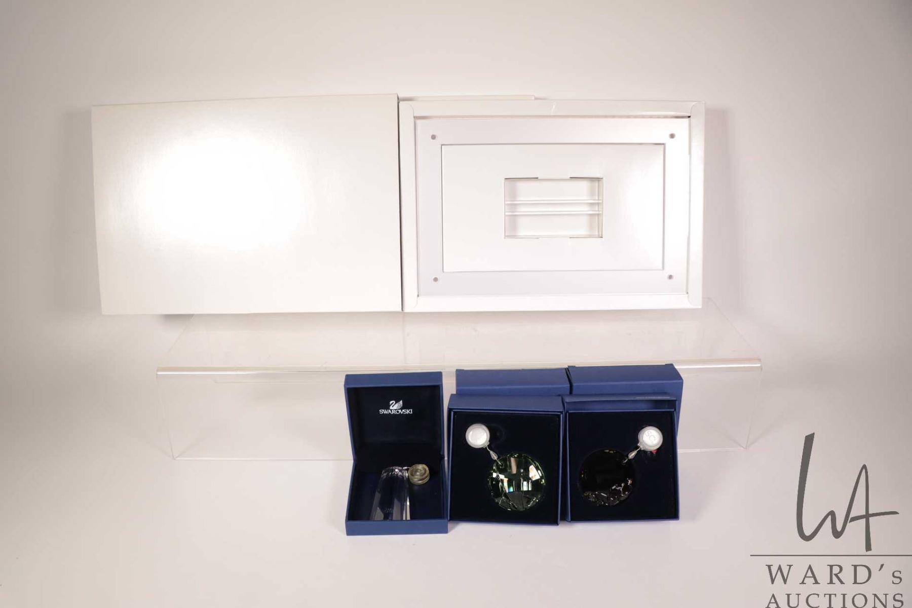 Three Swarovski crystal window ornaments and a window ornament hanging frame