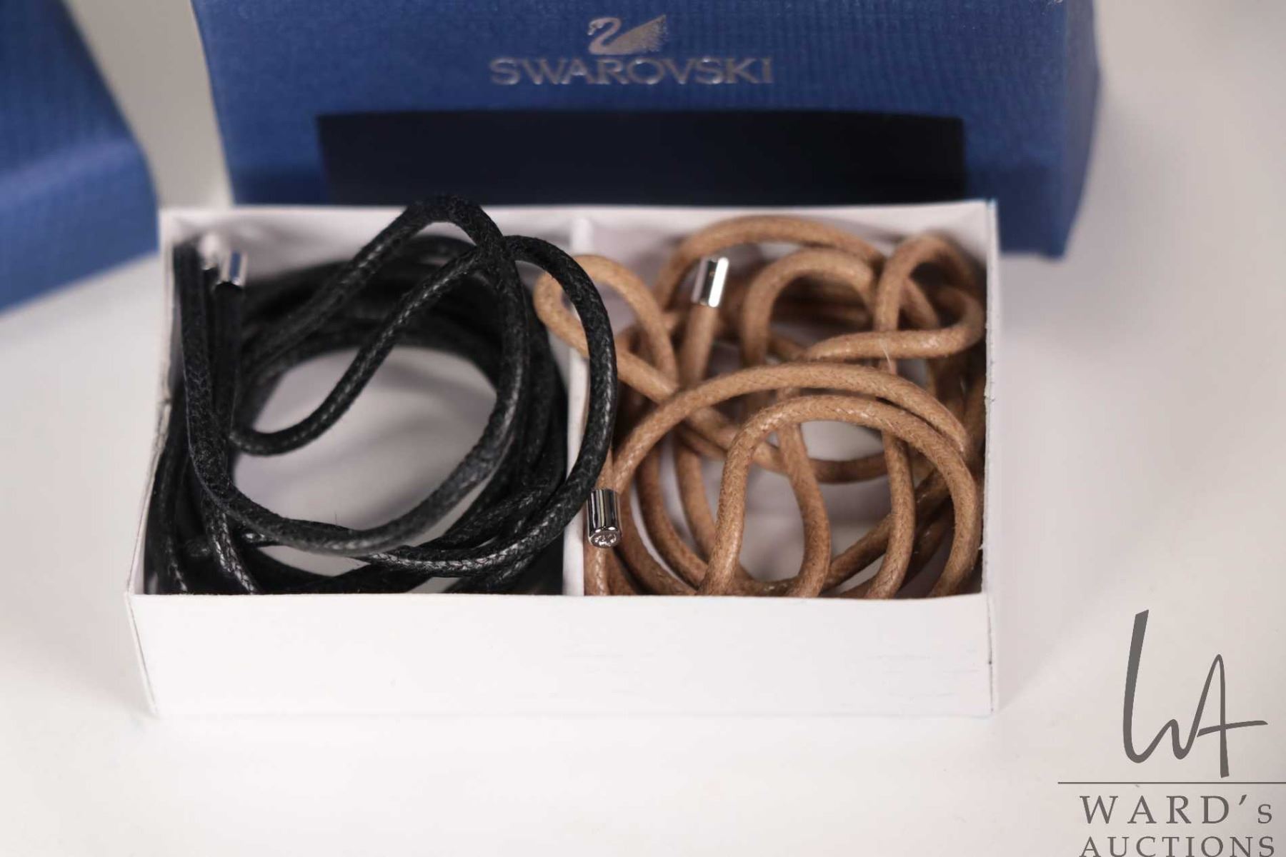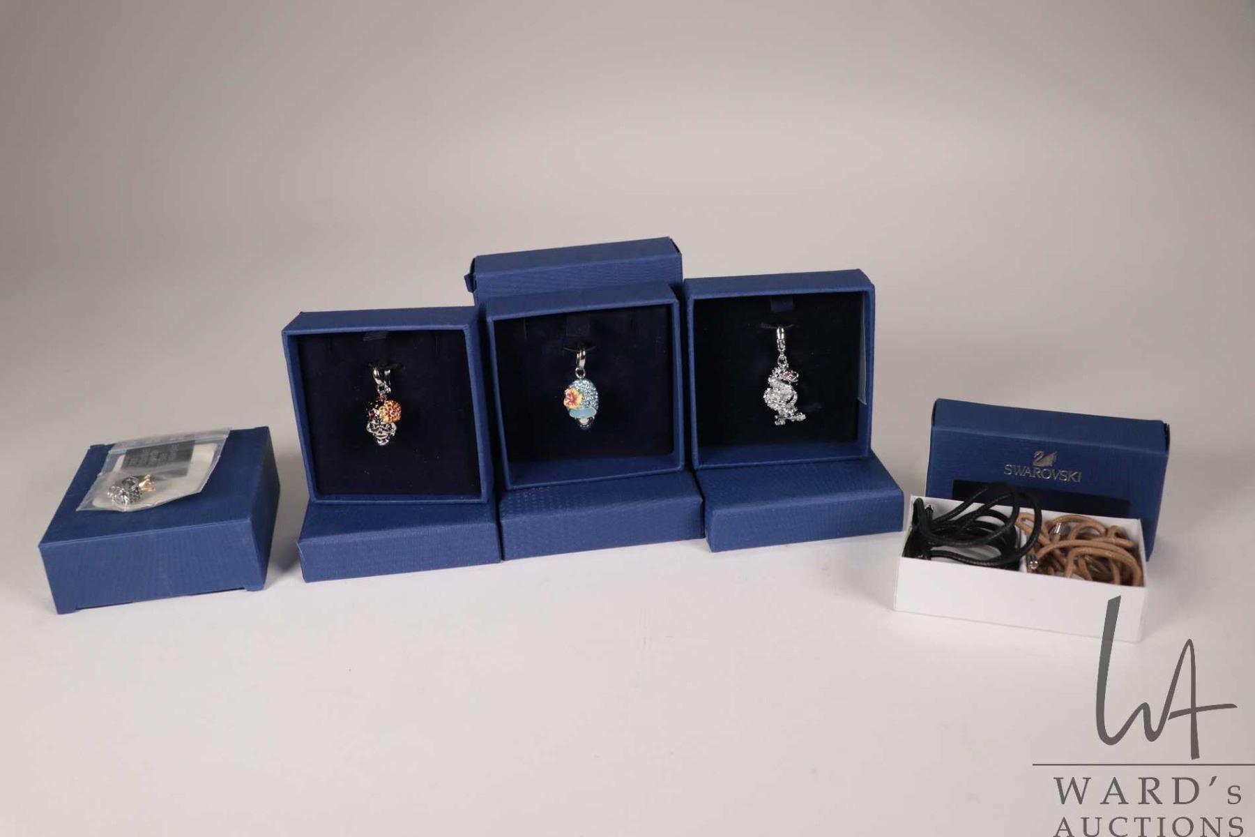 Three Swarovski hanging charms including two skulls and an Asian dragon plus a Chamilia .925 sterling silver" Skull Highness" bead and two Swarovski woven neck cords