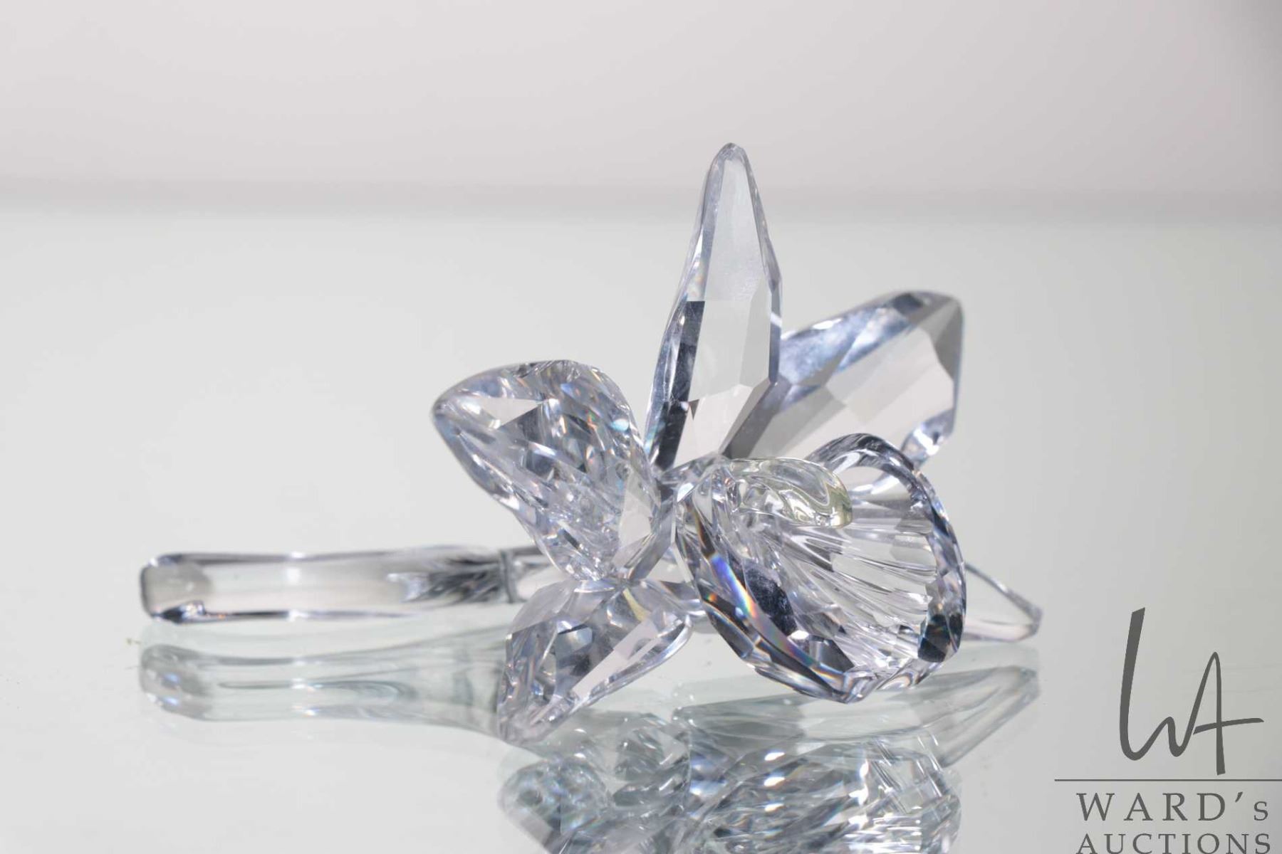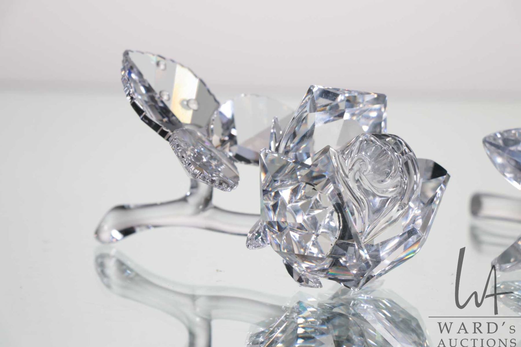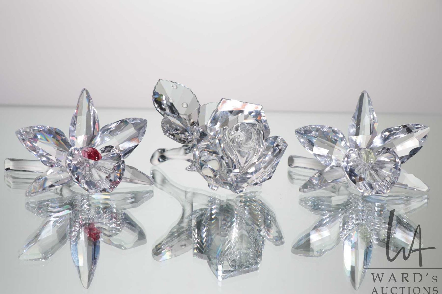 Three Swarvoski crystal collectibles including light pink orchid #7478, yellow orchid and rose