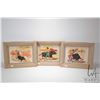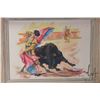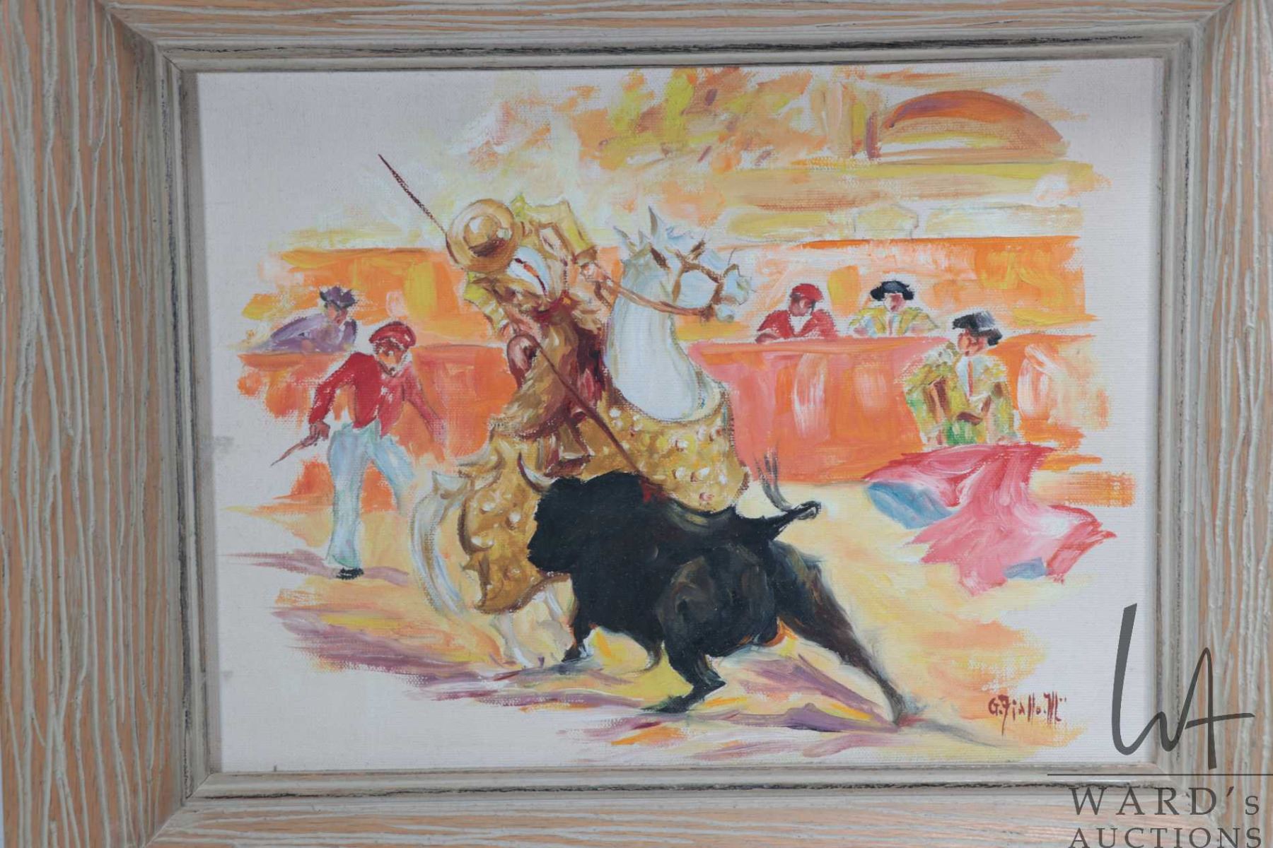 Three acrylic on board painting featuring bull fighting scenes and all signed by artist, 9" X 12". Note: Artwork shipments cannot be insured. Local pickup recommended
