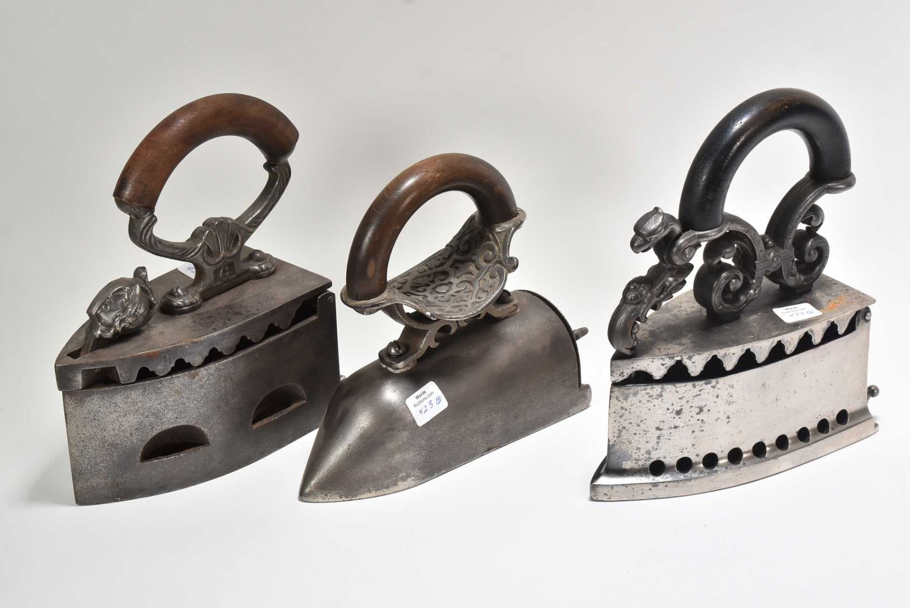 Three antique irons including cast iron charcoal iron with knight motif latch and ornate wood and metal handle, an ornate steel charcoal iron with griffin motif latch and wooden handle, and a cast iron with heating block, scroll design metal and wooden handle