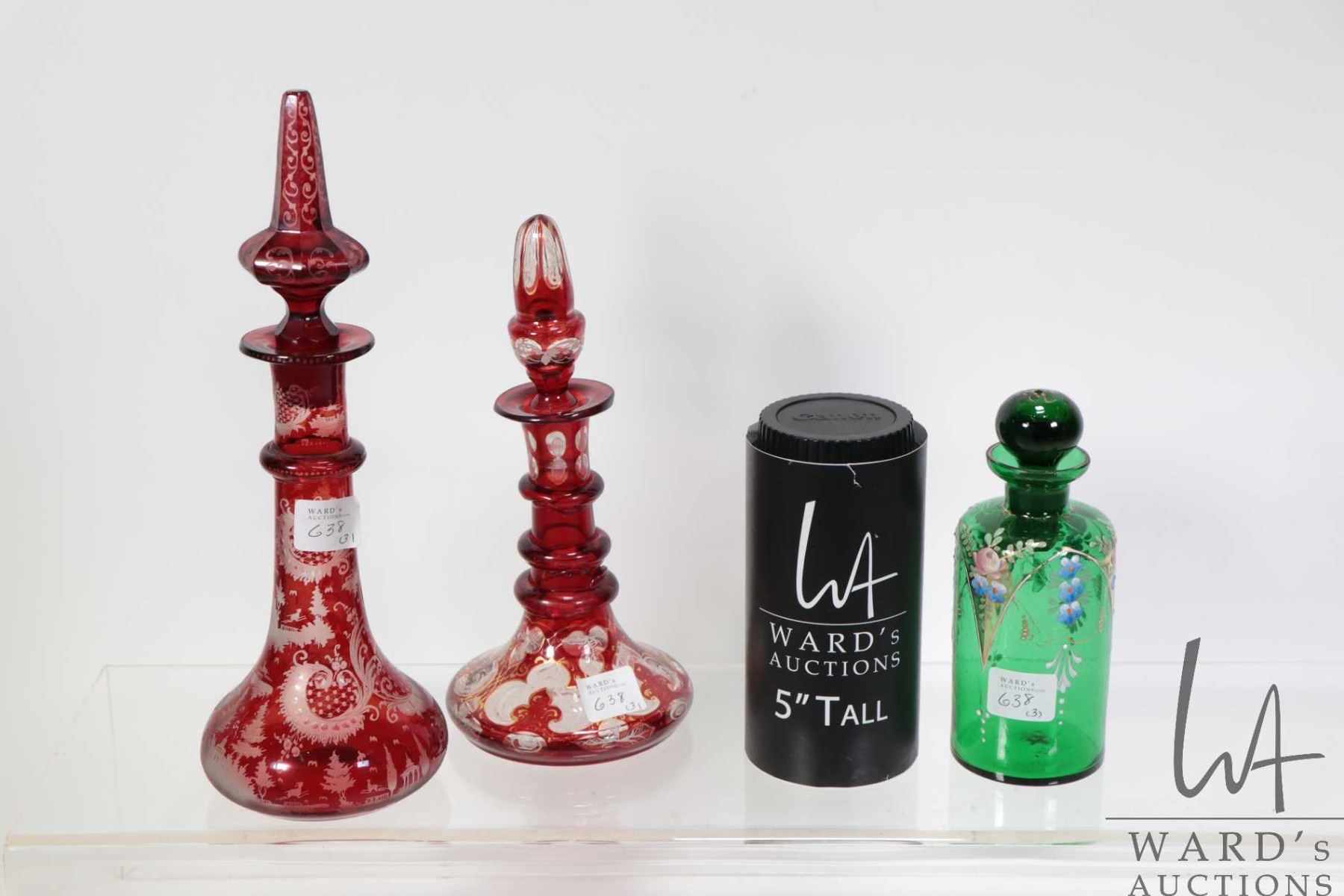 Three antique perfume bottles including hand painted green Bohemian glass and two red cut to clear bottles, all with stoppers, ranging from 6" in height to 10 1/2"