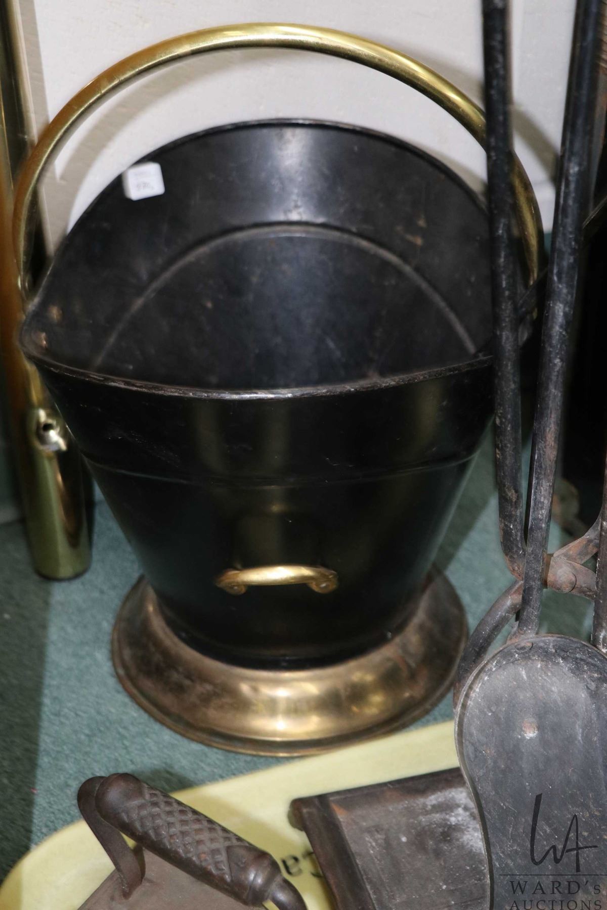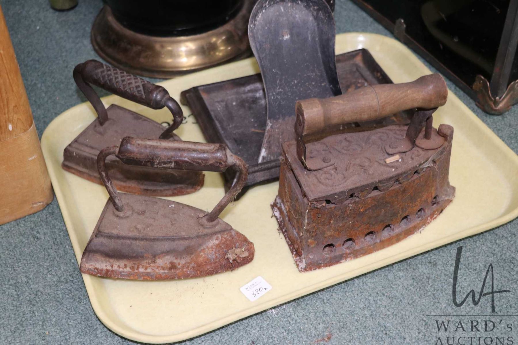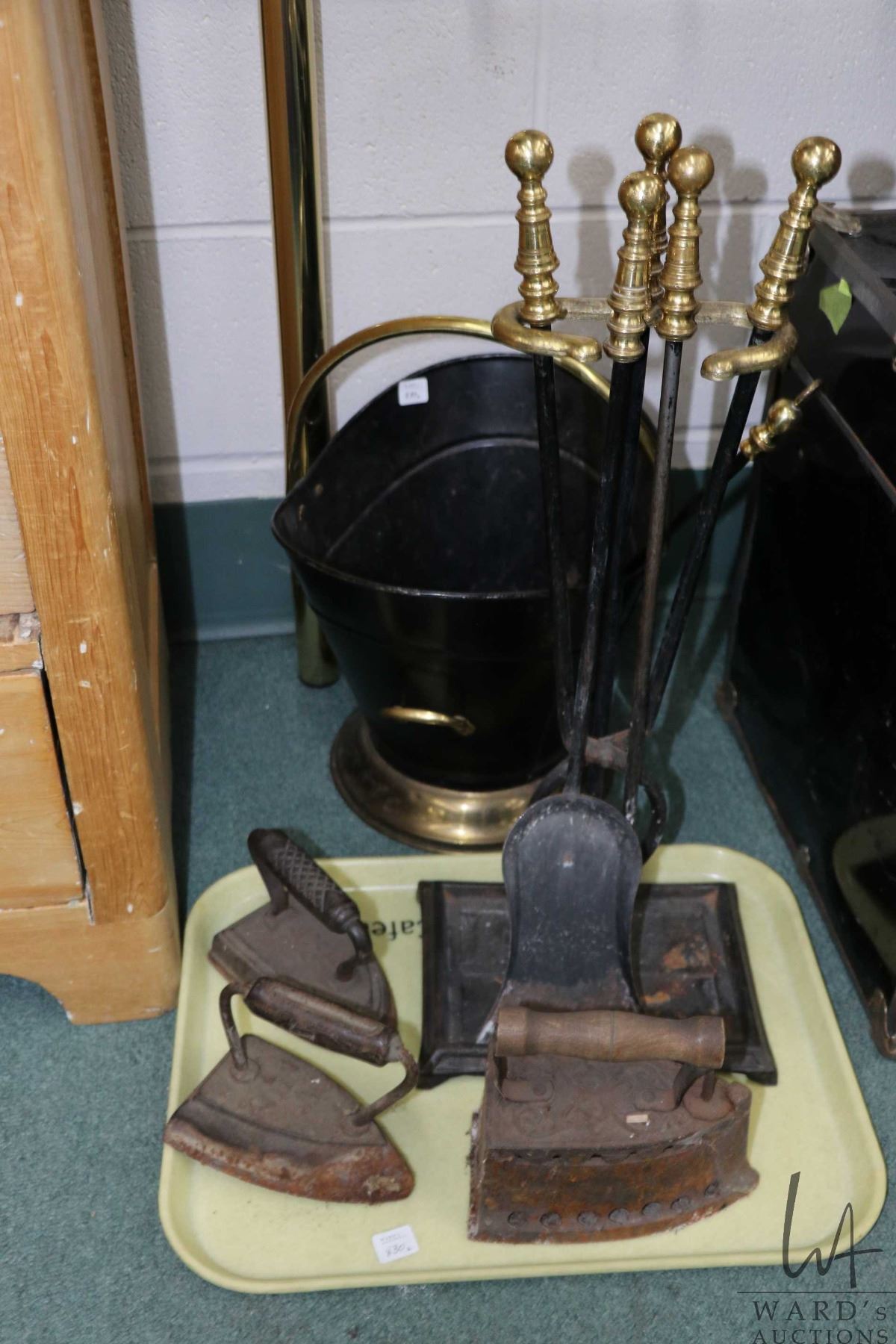 Three antique sadirons, three piece companion set plus coal hod with brush