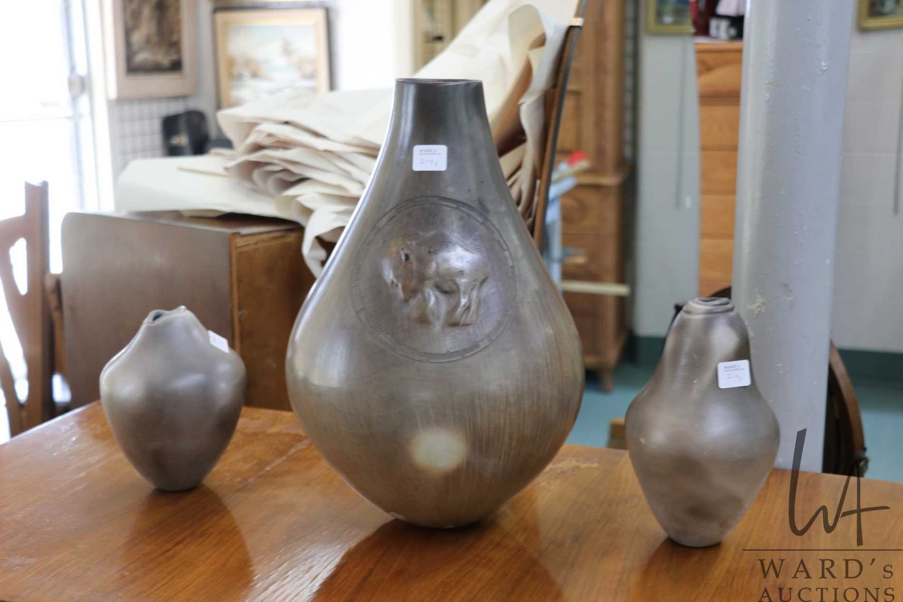 Three artisan made pottery vases including 14" decorative buffalo plus two small pottery vases, all