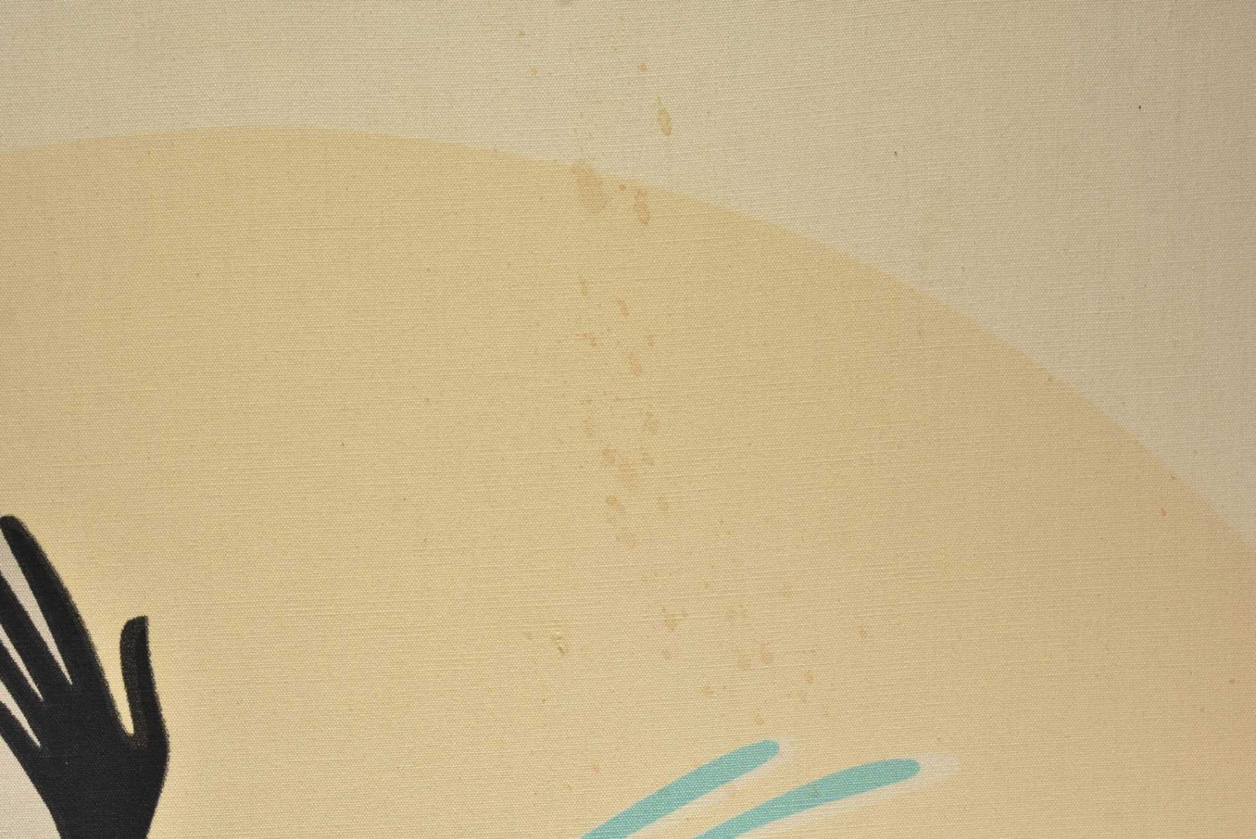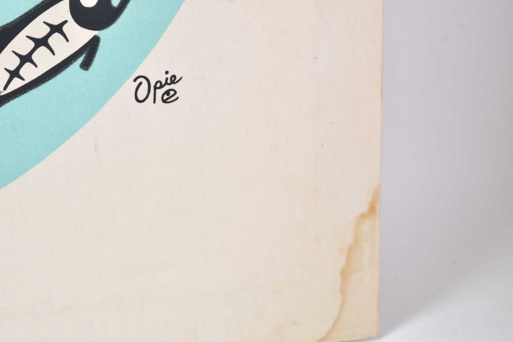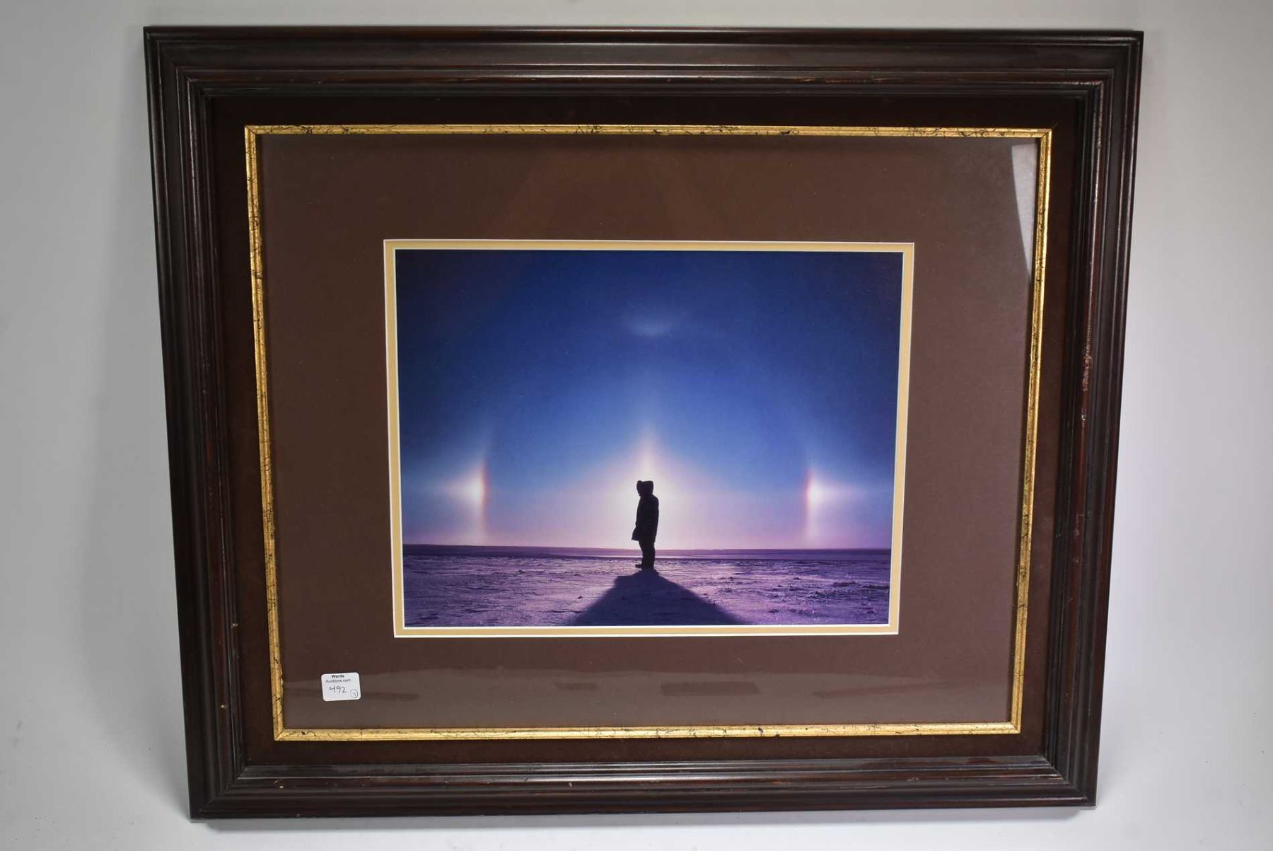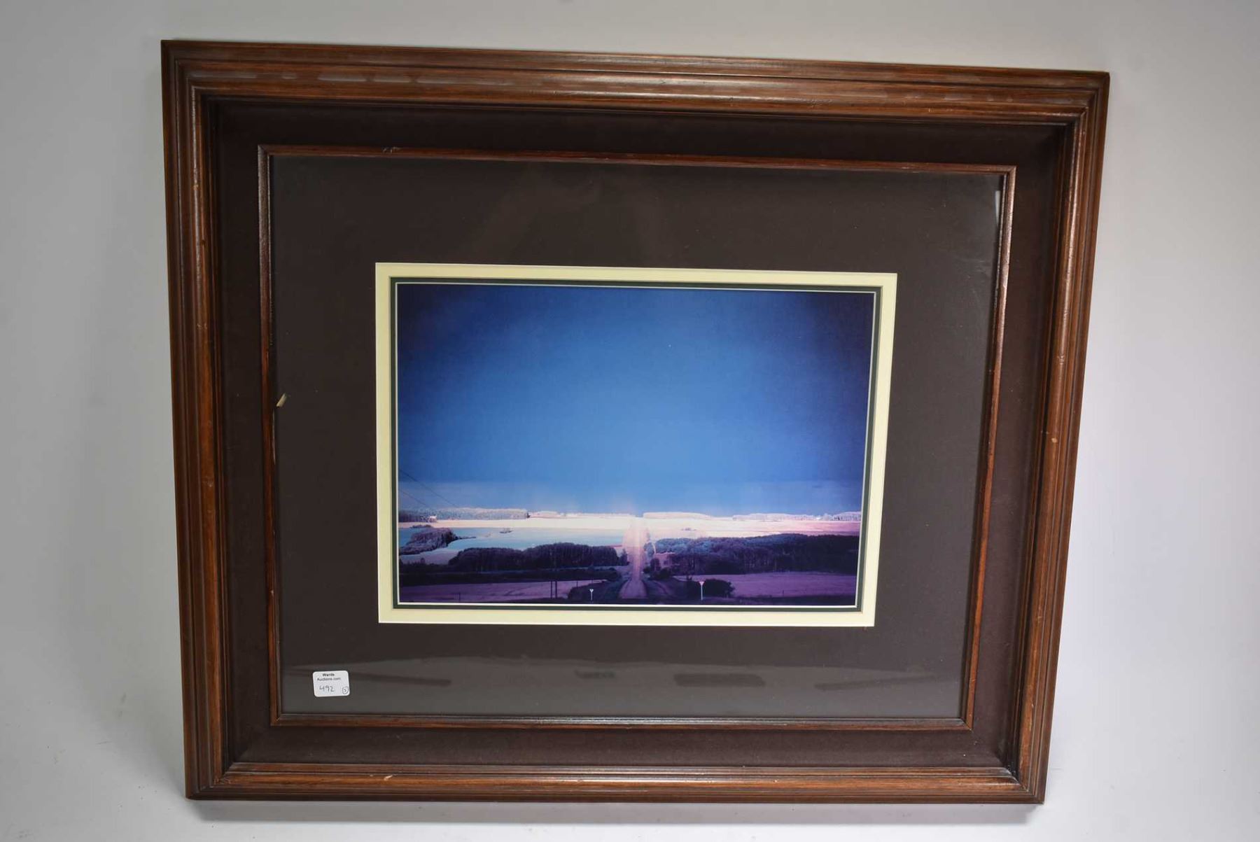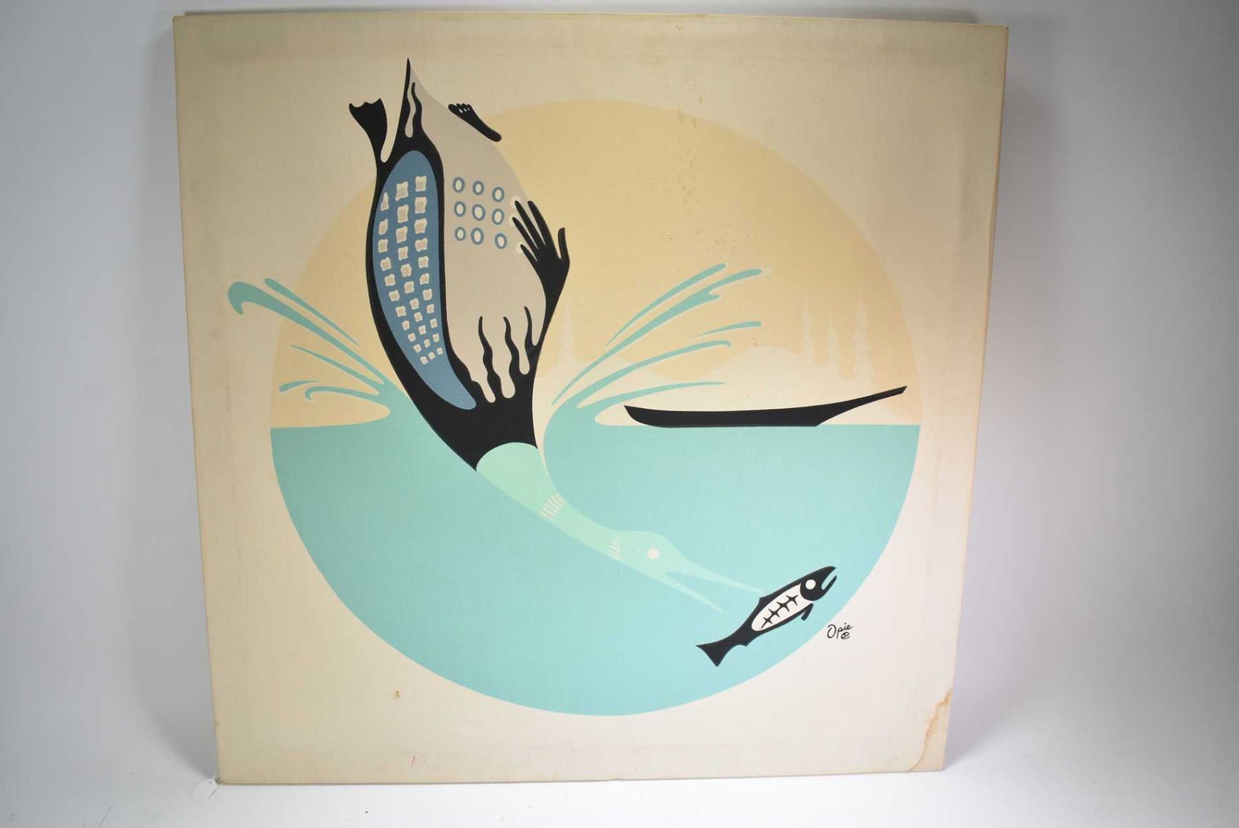 Three artworks including two framed photographs of northern Canada and a stretcher framed silk screen of a bird fishing signed by artist Opie, 32" X 32" , note staining to canvas