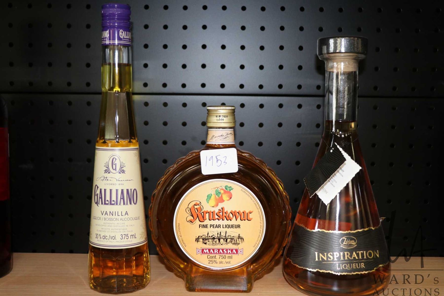 Three assorted bottles of liqueur including one Galliano Vanilla 375ml / 30% ABV, one Kruskovac Fine Pear Liqueur 750ml / 25% ABV, and a Zuidam Inspiration Liqueur Note: Alcohol cannot be insured by any courier in Canada. Local pick up is recommended. Canadian bidders only