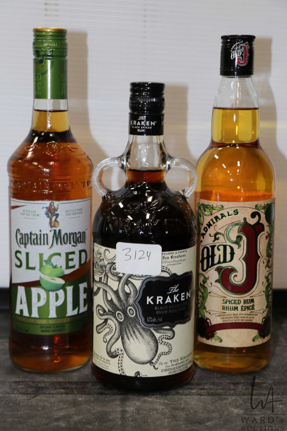 Three assorted bottles of liquor including one Captain Morgan Sliced Apple 750ml, one The Kraken Black Spiced Rum 750ml / 47% ABV, and one Admiral's Old J Spiced Rum Note: Alcohol cannot be insured by any courier in Canada. Local pick up is recommended. Canadian bidders only