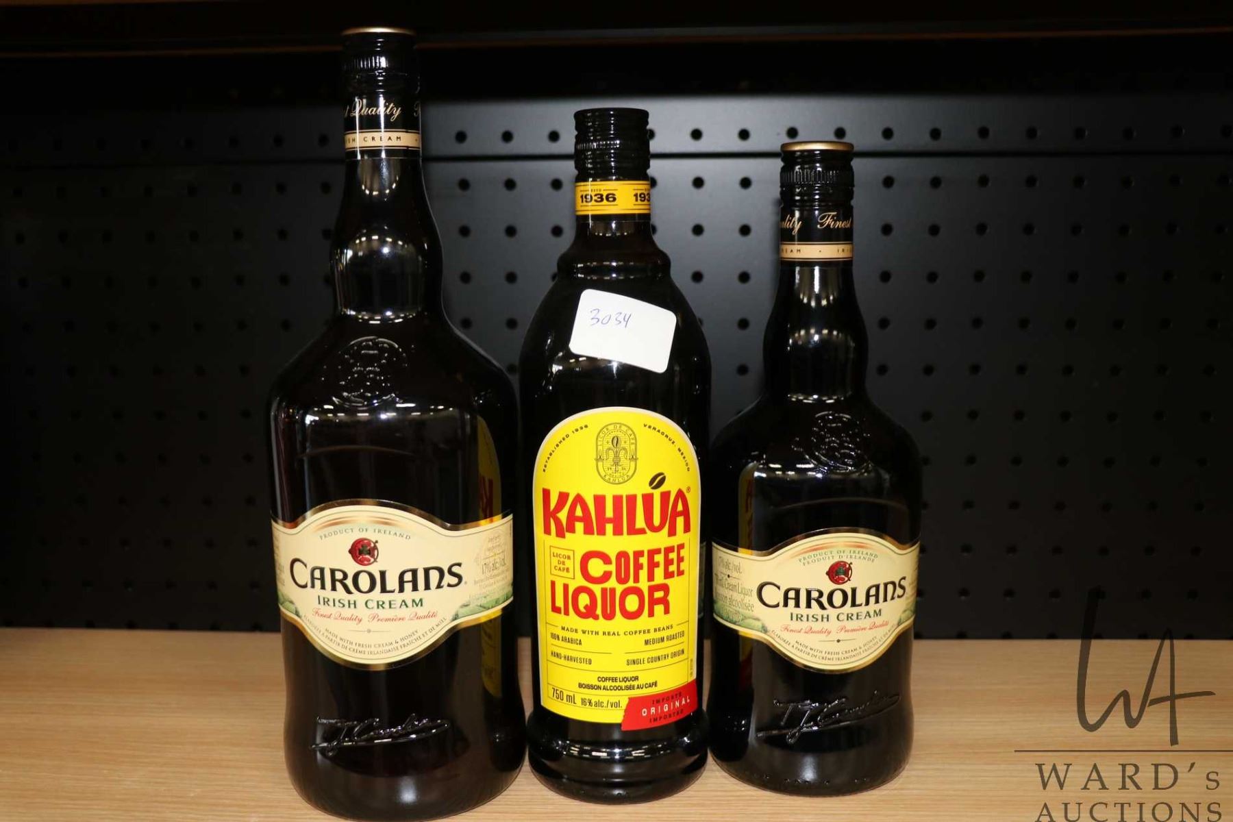 Three assorted bottles of liquor including one Carolans Irish Cream 1.0L / 17% ABV, one Carolans Irish Cream 750ml / 17% ABV and one Kahlua Coffee Liquor 750ml / 16% ABV Note: Alcohol cannot be insured by any courier in Canada. Local pick up is recommended. Canadian bidders only