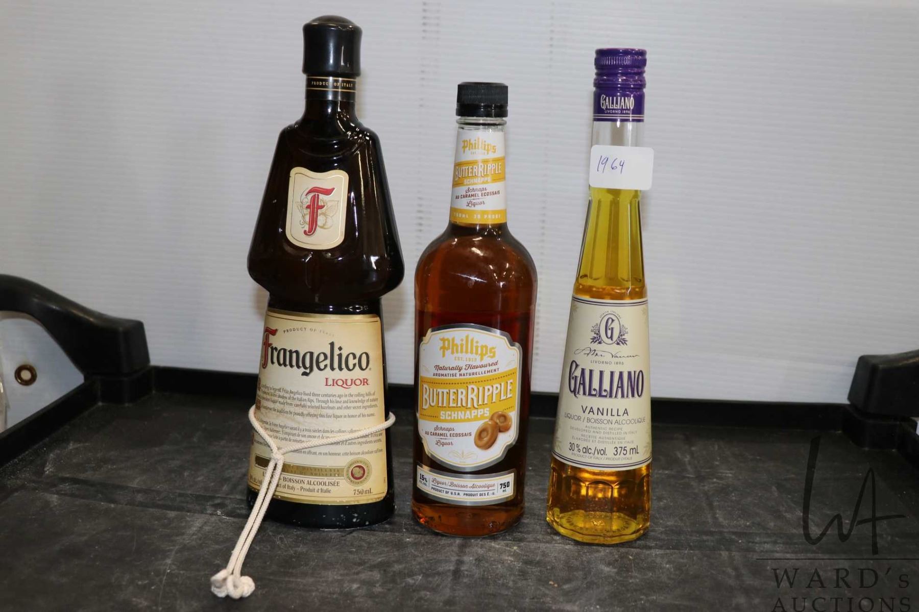 Three assorted bottles of liquor including one Frangelico Liquor 750ml / 20% ABV, one Phillips Butter Ripple Schnapps 750ml / 15% ABV and one Galliano Vanilla liquor 375ml / 30% ABV Note: Alcohol cannot be insured by any courier in Canada. Local pick up is recommended. Canadian bidders only