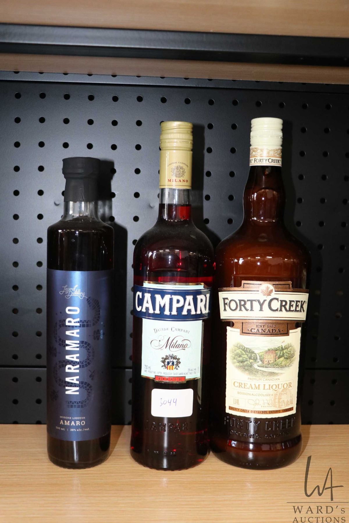 Three assorted bottles of liquor including one Legend Distilling Naramaro 500ml / 30% ABV, one Campari Milano Bitter 750ml / 25% ABV, and one Forty Creek Cream Liquor 1.14L / 17% ABV Note: Alcohol cannot be insured by any courier in Canada. Local pick up is recommended. Canadian bidders only