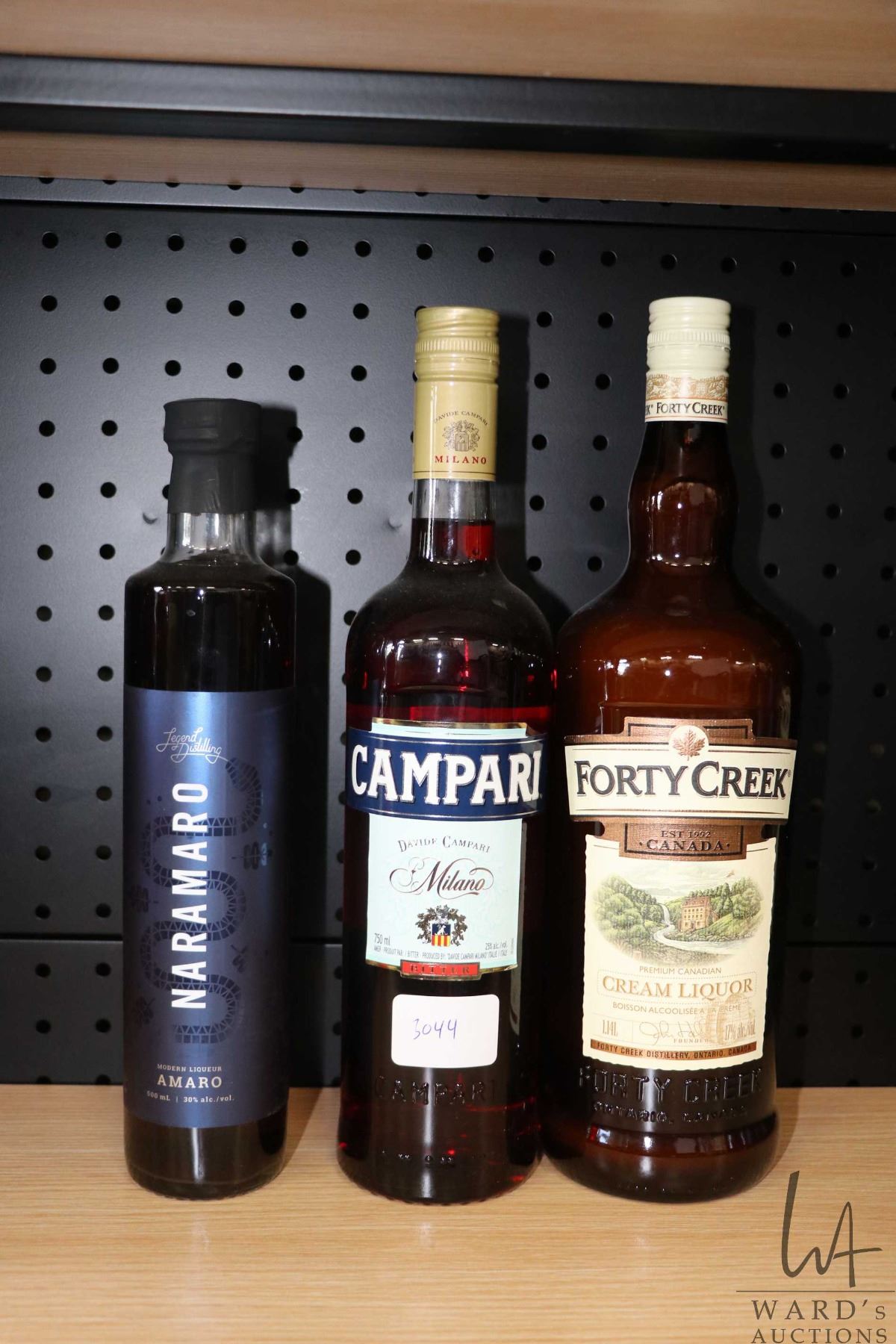 Three assorted bottles of liquor including one Legend Distilling Naramaro 500ml / 30% ABV, one Campari Milano Bitter 750ml / 25% ABV, and one Forty Creek Cream Liquor 1.14L / 17% ABV Note: Alcohol cannot be insured by any courier in Canada. Local pick up is recommended. Canadian bidders only