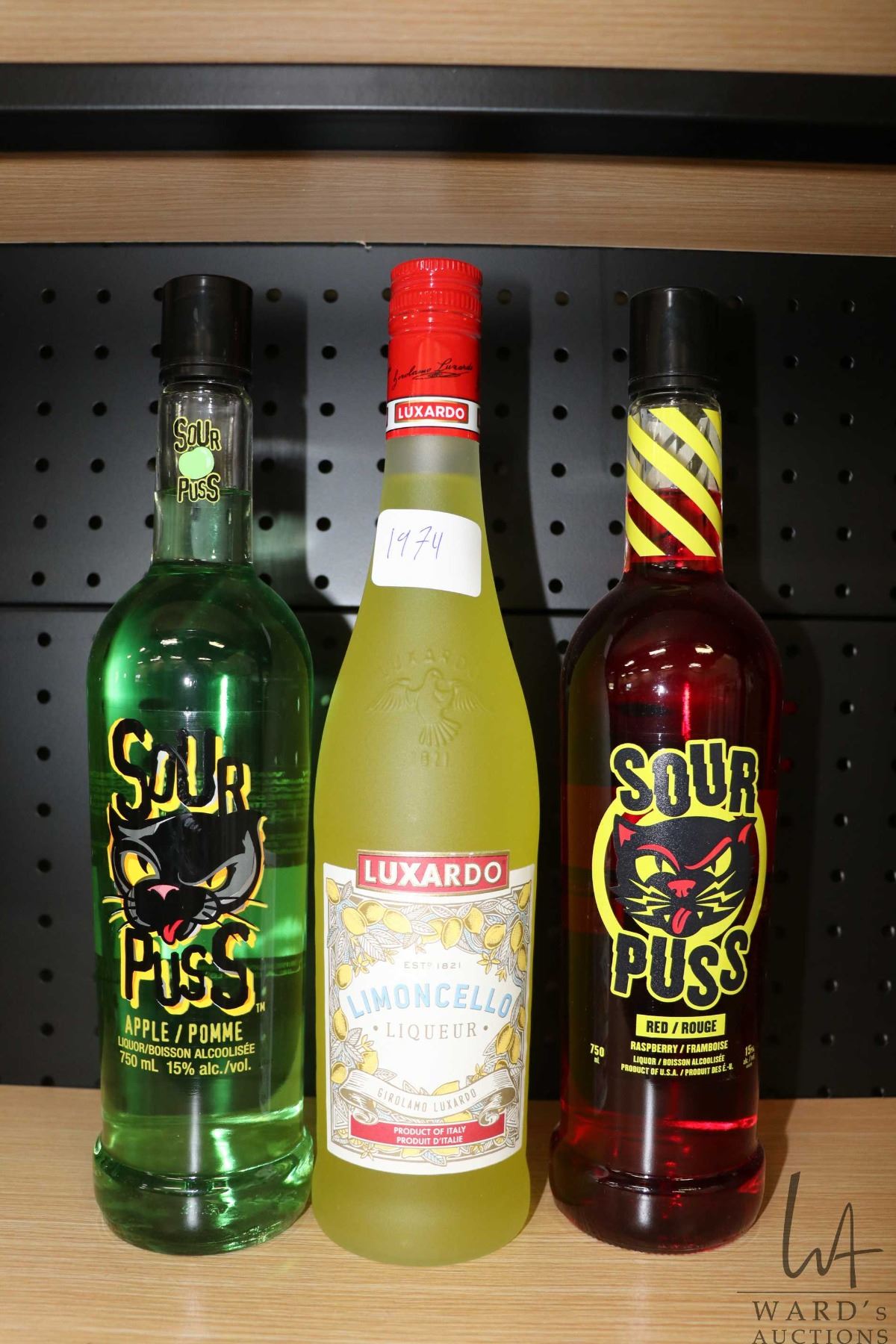Three assorted bottles of liquor including one Luxardo Limoncello 750ml, one Sour Puss Apple 750ml / 15% ABV and one Sour Puss Red Raspberry 750ml / 15% ABV Note: Alcohol cannot be insured by any courier in Canada. Local pick up is recommended. Canadian bidders only