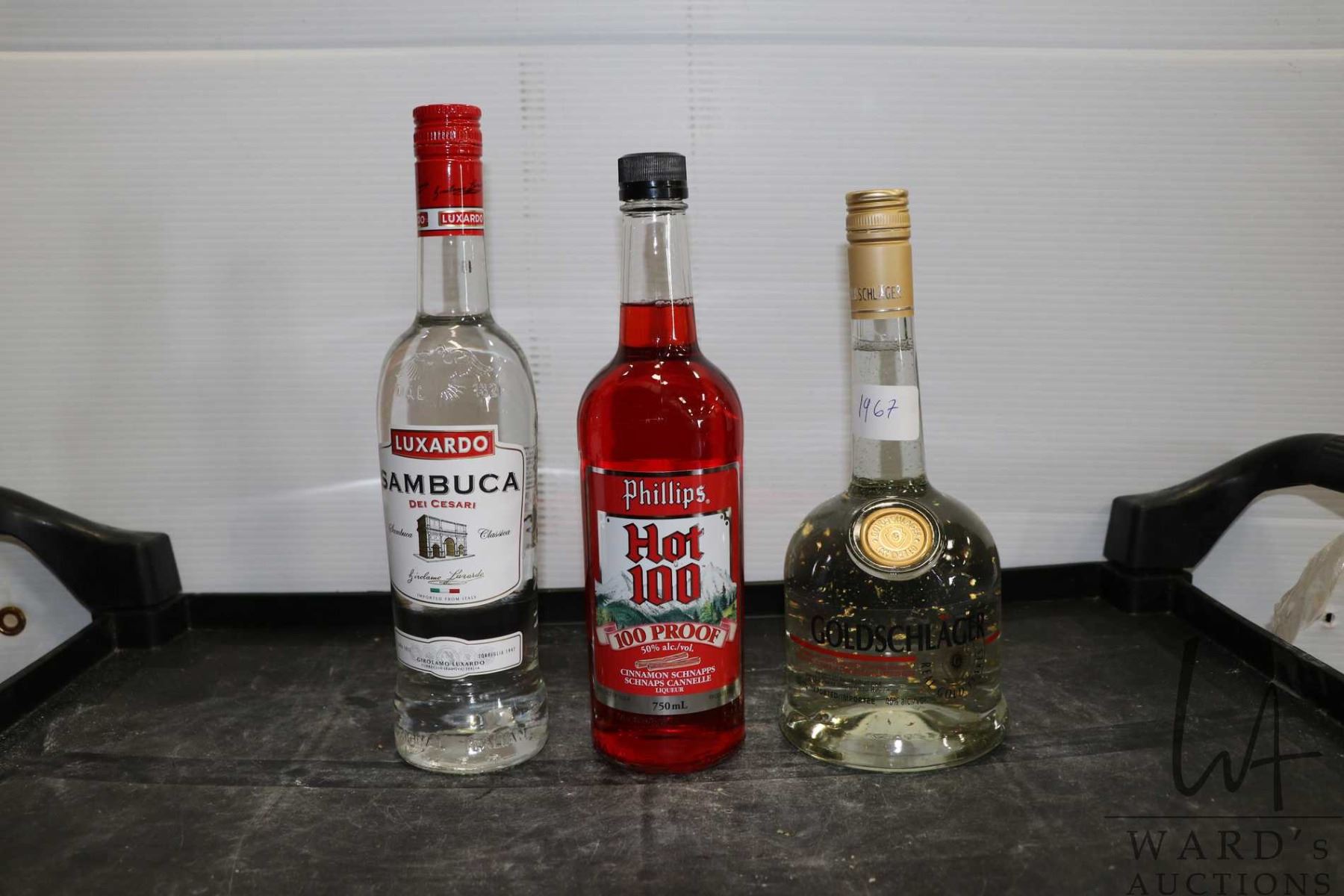 Three assorted bottles of liquor including one Luxardo Sambuca 750ml, one Phillips Hot 100 Cinnamon Schnapps 750ml / 50% ABV, and one Goldschlager Cinnamon Schnapps with Gold Flakes 750ml / 40% ABV Note: Alcohol cannot be insured by any courier in Canada. Local pick up is recommended. Canadian bidders only