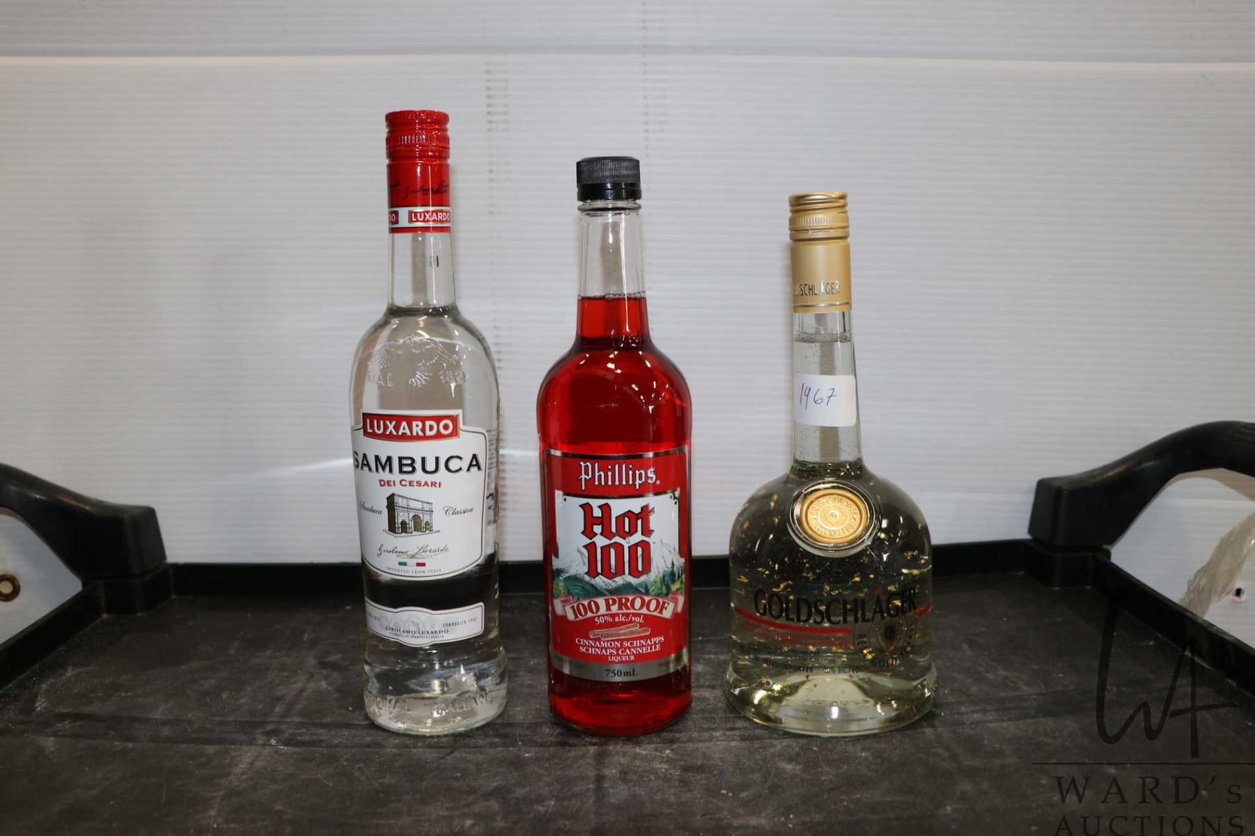 Three assorted bottles of liquor including one Luxardo Sambuca 750ml, one Phillips Hot 100 Cinnamon Schnapps 750ml / 50% ABV and one Goldschlager Cinnamon Schnapps w/ gold flakes 750ml / 40% ABV Note: Alcohol cannot be insured by any courier in Canada. Local pick up is recommended. Canadian bidders only