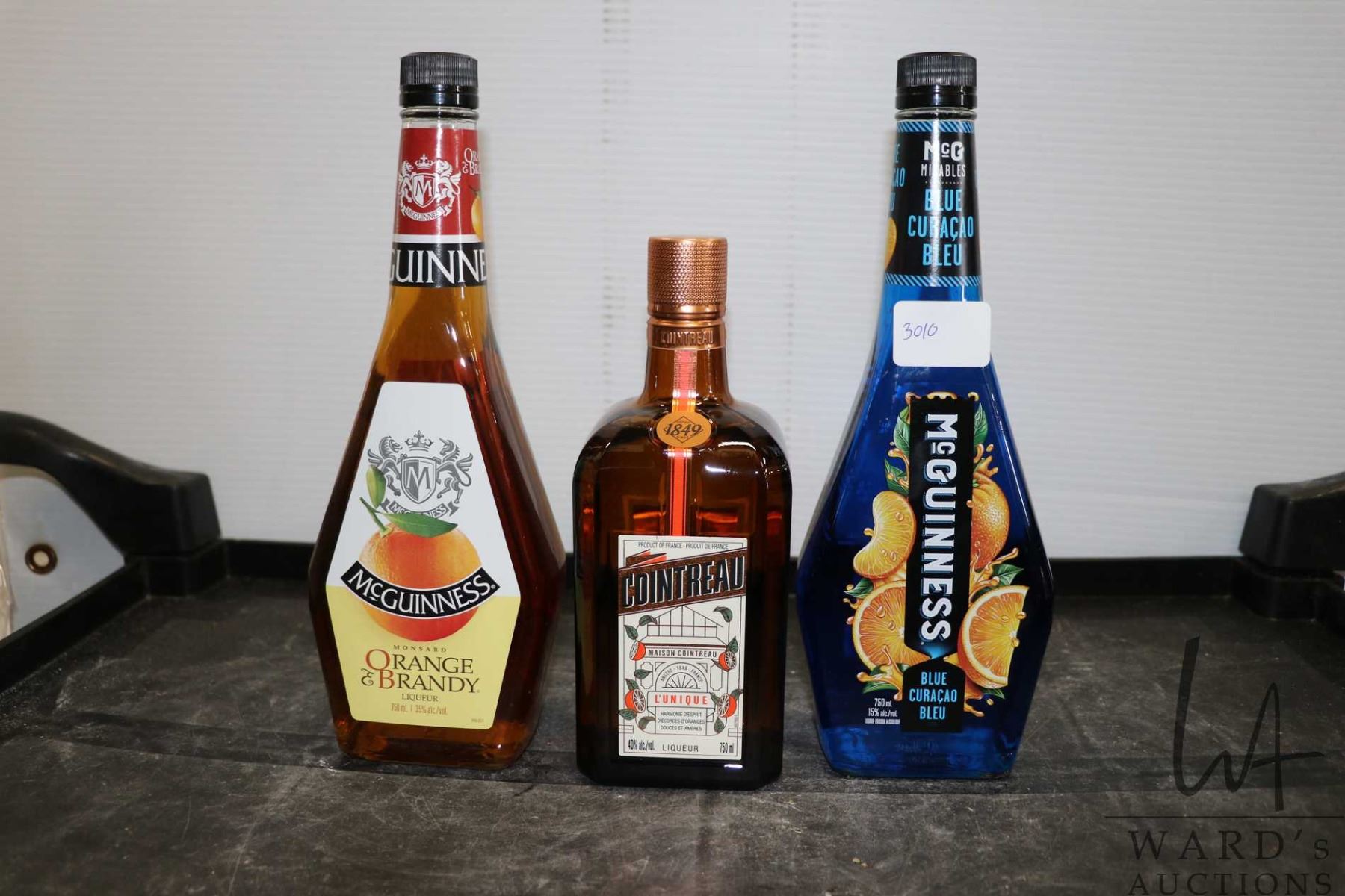 Three assorted bottles of liquor including one McGuiness Orange & Brandy 750ml / 35% ABV, one McGuiness Blue Curacao 750ml / 15% ABV, and one Cointreau L'unique Liqueur 750ml / 40% ABV Note: Alcohol cannot be insured by any courier in Canada. Local pick up is recommended. Canadian bidders only