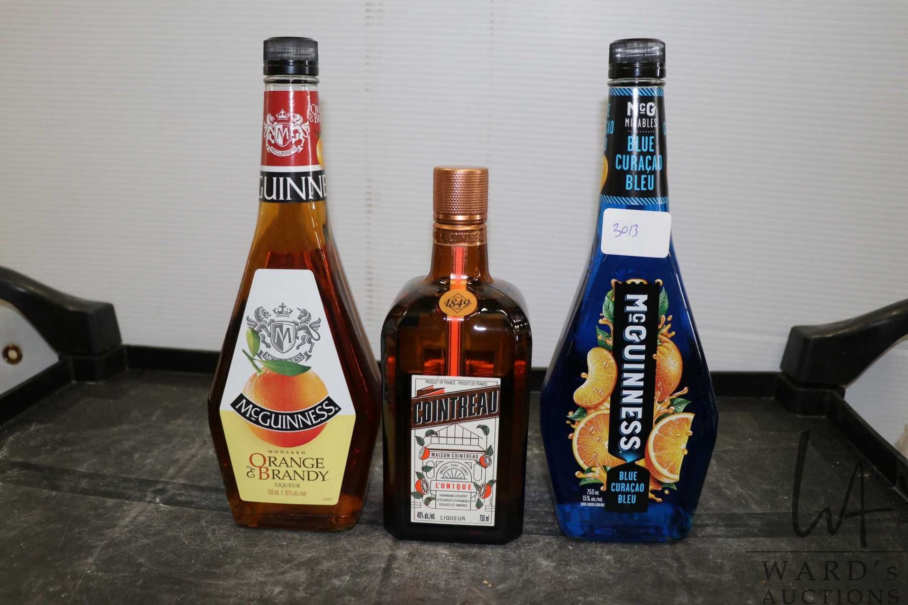Three assorted bottles of liquor including one McGuiness Orange & Brandy 750ml / 35% ABV, one McGuiness Blue Curacao 750ml / 15% ABV, and one Cointreau L'unique Liqueur 750ml / 40% ABV Note: Alcohol cannot be insured by any courier in Canada. Local pick up is recommended. Canadian bidders only