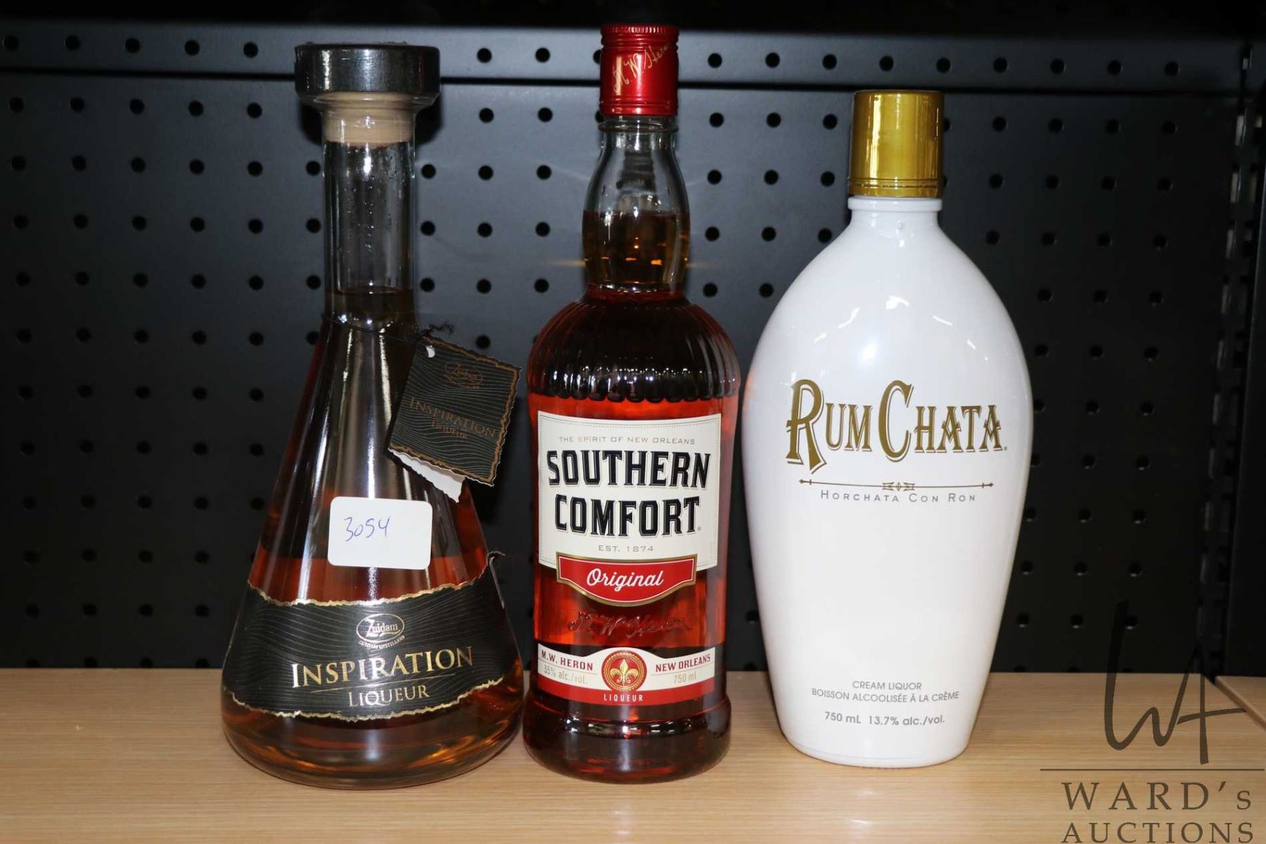 Three assorted bottles of liquor including one Southern Comfort Original 750ml / 35% ABV, one Zuidam Distillers Inspiration Liqueur, and one Rum Chata Horchata Con Ron 750ml / 13.7% ABV Note: Alcohol cannot be insured by any courier in Canada. Local pick up is recommended. Canadian bidders only