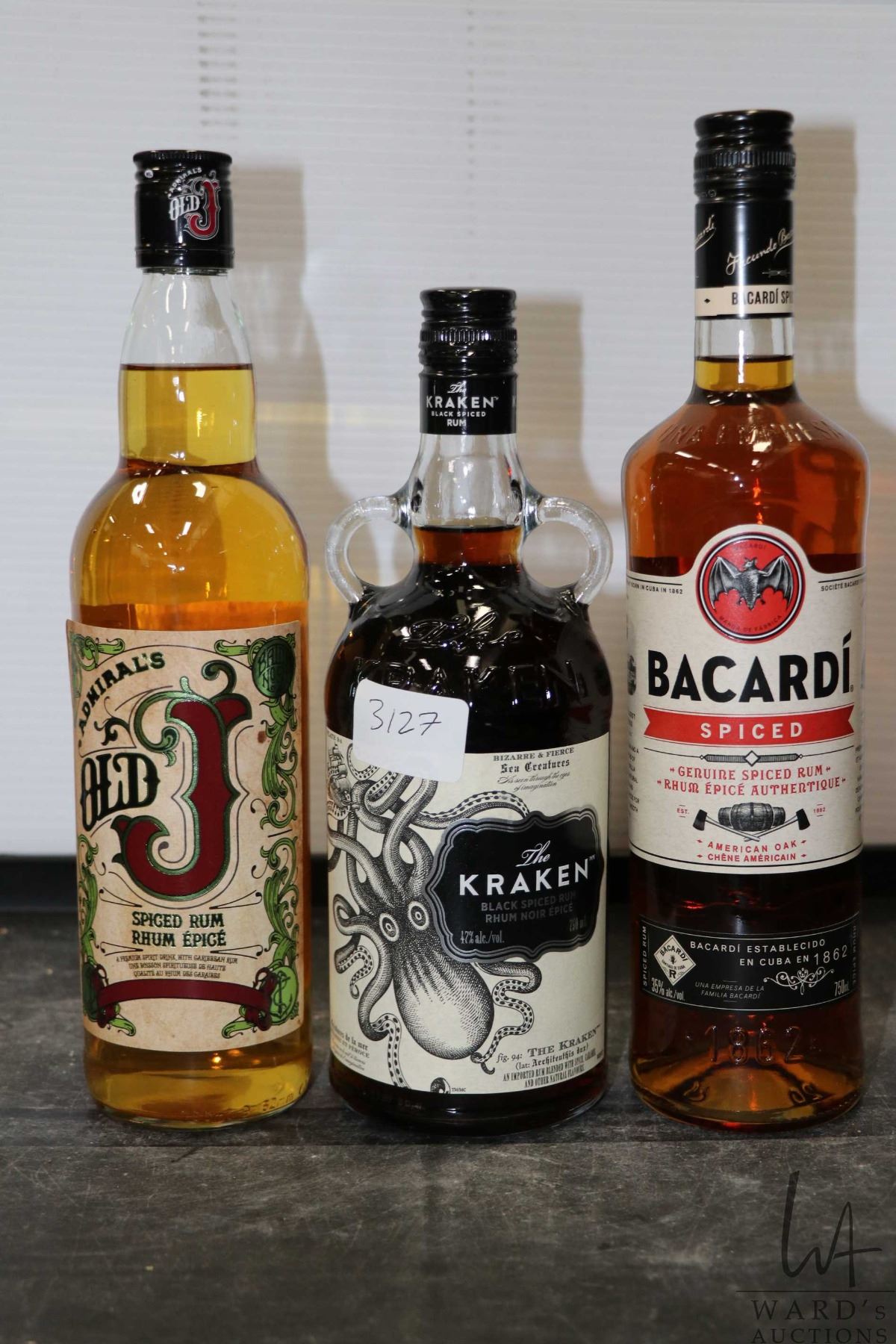Three assorted bottles of rum including one Admiral's Old J Spiced Rum, one The Kraken Black Spiced Rum 750ml / 47% ABV, and one Bacardi Spiced 750ml / 35% ABV Note: Alcohol cannot be insured by any courier in Canada. Local pick up is recommended. Canadian bidders only