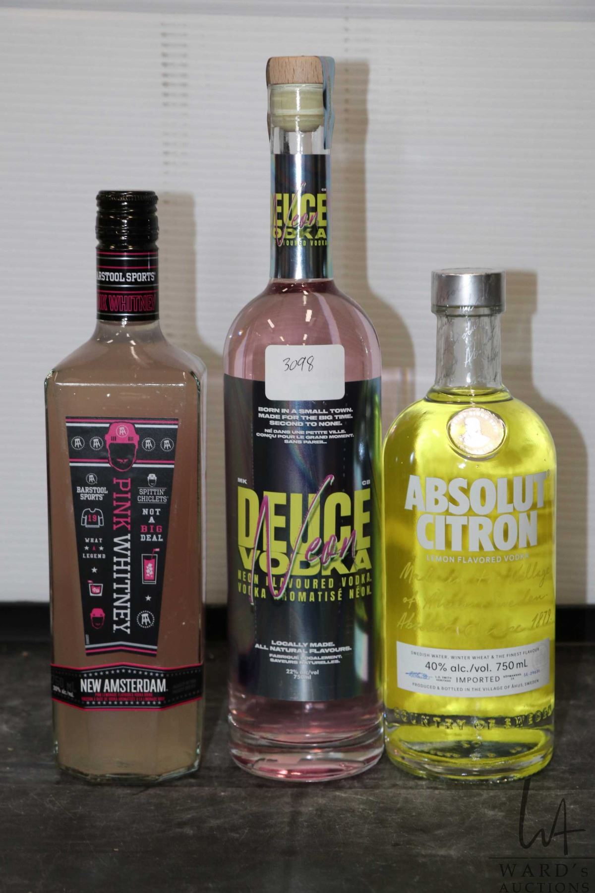 Three assorted bottles of vodka including one Absolut Citron Lemon Vodka 750ml / 40% ABV, one Pink Whitney New Amsterdam Lemonade Vodka 750ml / 30% ABV, and one Deuce Vodka Neon Flavoured Vodka 750ml / 22% ABV Note: Alcohol cannot be insured by any courier in Canada. Local pick up is recommended. Canadian bidders only