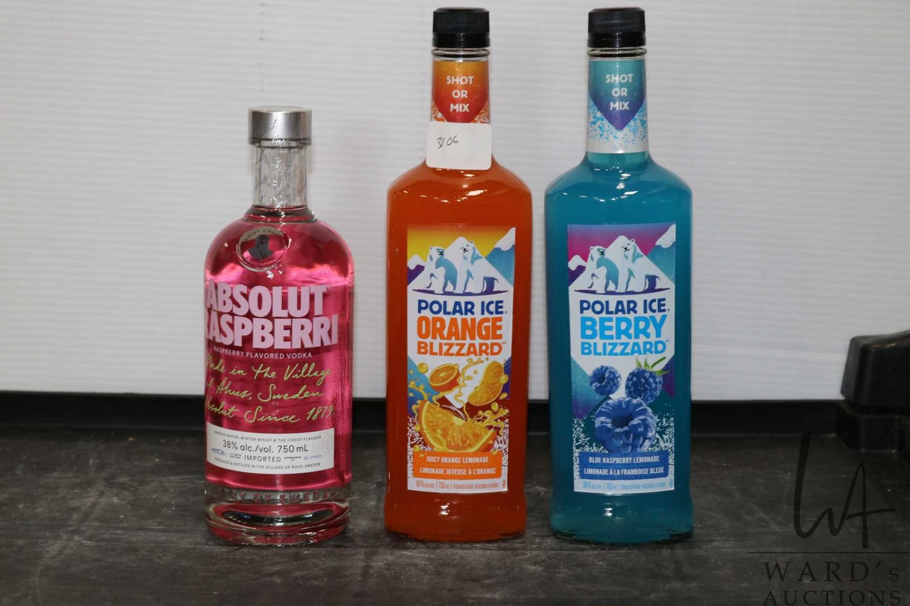 Three assorted bottles of vodka including one Absolut Raspberri 750ml / 38% ABV, one Polar Ice Orange Blizzard Juicy Orange Lemonade 750ml / 30% ABV, and one Polar Ice Berry Blizard blue raspberry lemonade 750ml / 30% ABV Note: Alcohol cannot be insured by any courier in Canada. Local pick up is recommended. Canadian bidders only