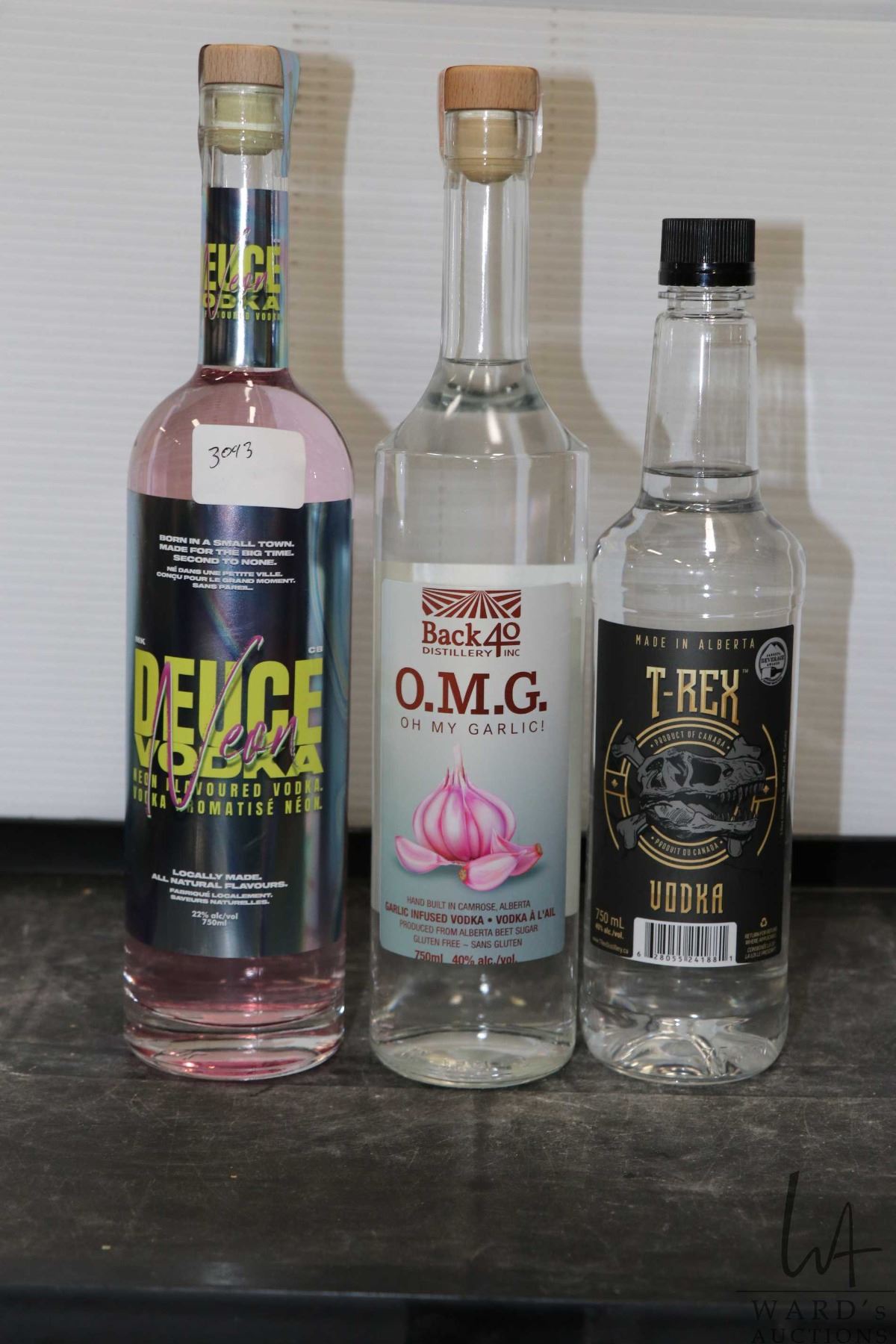 Three assorted bottles of vodka including one Back 40 Distillery Inc O.M.G Garlic Infused Vodka 750ml / 40% ABV, one T-Rex Vodka 750ml / 40% ABV, and one Deuce Vodka Neon Flavoured Vodka 750ml / 22% ABV Note: Alcohol cannot be insured by any courier in Canada. Local pick up is recommended. Canadian bidders only