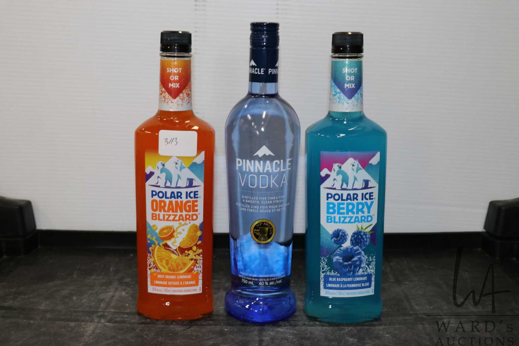 Three assorted bottles of vodka including one Polar Ice Orange Blizzard Lemonade 750ml / 30% ABV, one Polar Ice Berry Blizzard blue raspberry lemonade 750ml / 30% ABV, and one Pinnacle Vodka 750ml / 40% ABV Note: Alcohol cannot be insured by any courier in Canada. Local pick up is recommended. Canadian bidders only